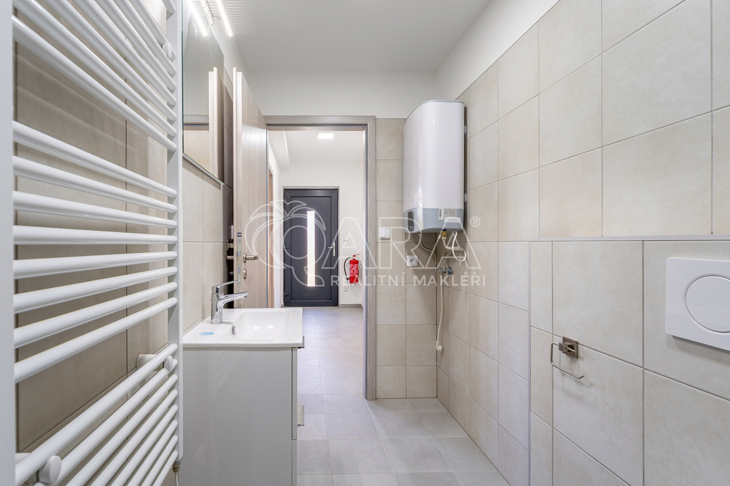 Ateliér o podlahové ploše 33,35 m² se nachází v 1. nadzemním podlaží (přízemí) cihlového domu. Skládá se ze zádveří o výměře 4,7 m², ze kterého vstoupíte do hlavní místnosti o výměře 24,1 m². Součástí je nová kuchyňská linka se spotřebiči (elektrickou troubou, varnou deskou, digestoří a lednicí s mrazákem a přípojkou na pračku). Ateliér je vhodný nejen k bydlení, ale i pro dočasné ubytování nebo komerční využití. Koupelna je vybavena prostorným sprchovým koutem, umyvadlem se skříňkou, zrcadlem a WC.
