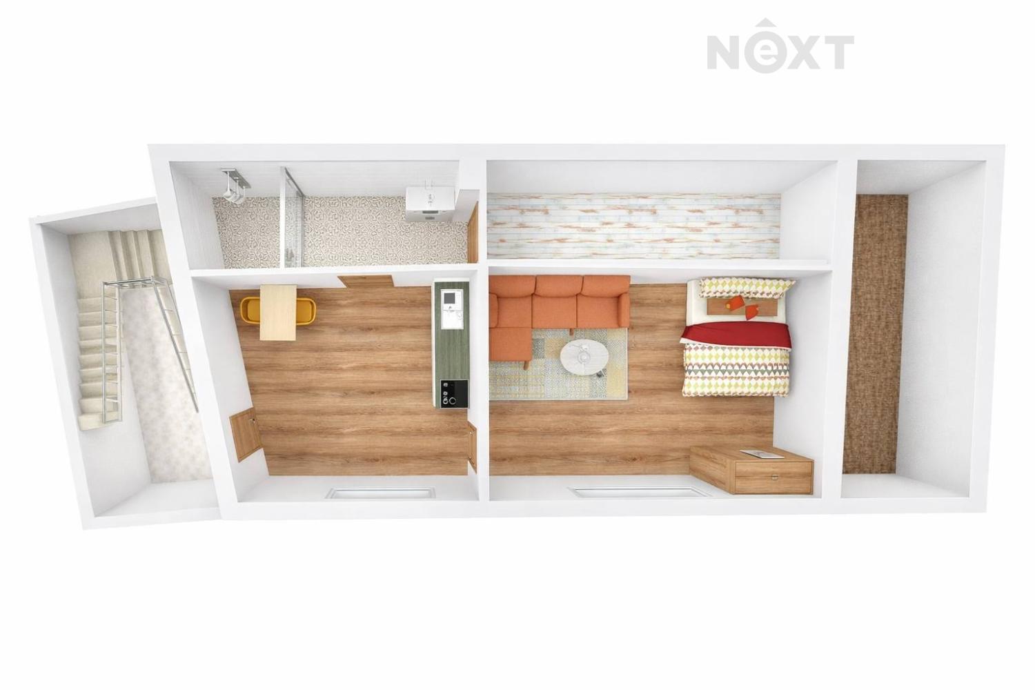 V mezipatře domu se nachází další dva pokoje, přičemž jeden je průchozí – vhodné např. jako pracovna, posilovna, pokoj pro hosty či rozšíření obytného prostoru.