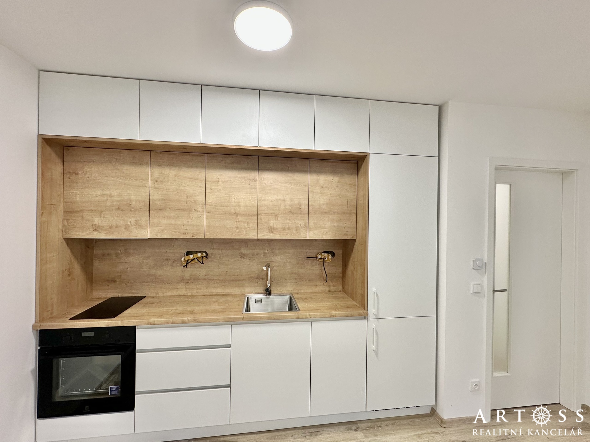 V bytě bude kuchyňská linka vyrobena na míru od stolařství FAIN Interier, vč. vestavěných spotřebičů a to elektrické trouby, indukční desky, digestoře, myčky a chladničky s mrazákem.