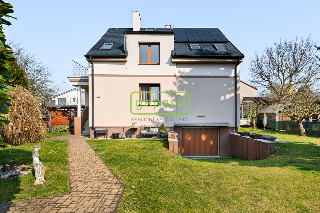 Dům je částečně podsklepený, přičemž suterén slouží jako plnohodnotné technické zázemí – najdete zde kotelnu, sklepy i prostornou garáž pro dvě auta se samostatným vjezdem. Konstrukčně jde o kombinaci klasického zděného systému (cihla + porobeton), . Střecha je zateplená, řešená hambálkovým krovem s krytinou, částečně osazená solárními panely. Okna jsou plastová s dvojskly, interiérové prvky jsou ve velmi dobrém stavu a ladí s celkovou atmosférou domu . Vytápění zajišťuje plynový kotel, v koupelnách je využito podlahové topení. Dům je napojen na veřejný vodovod i kanalizaci.