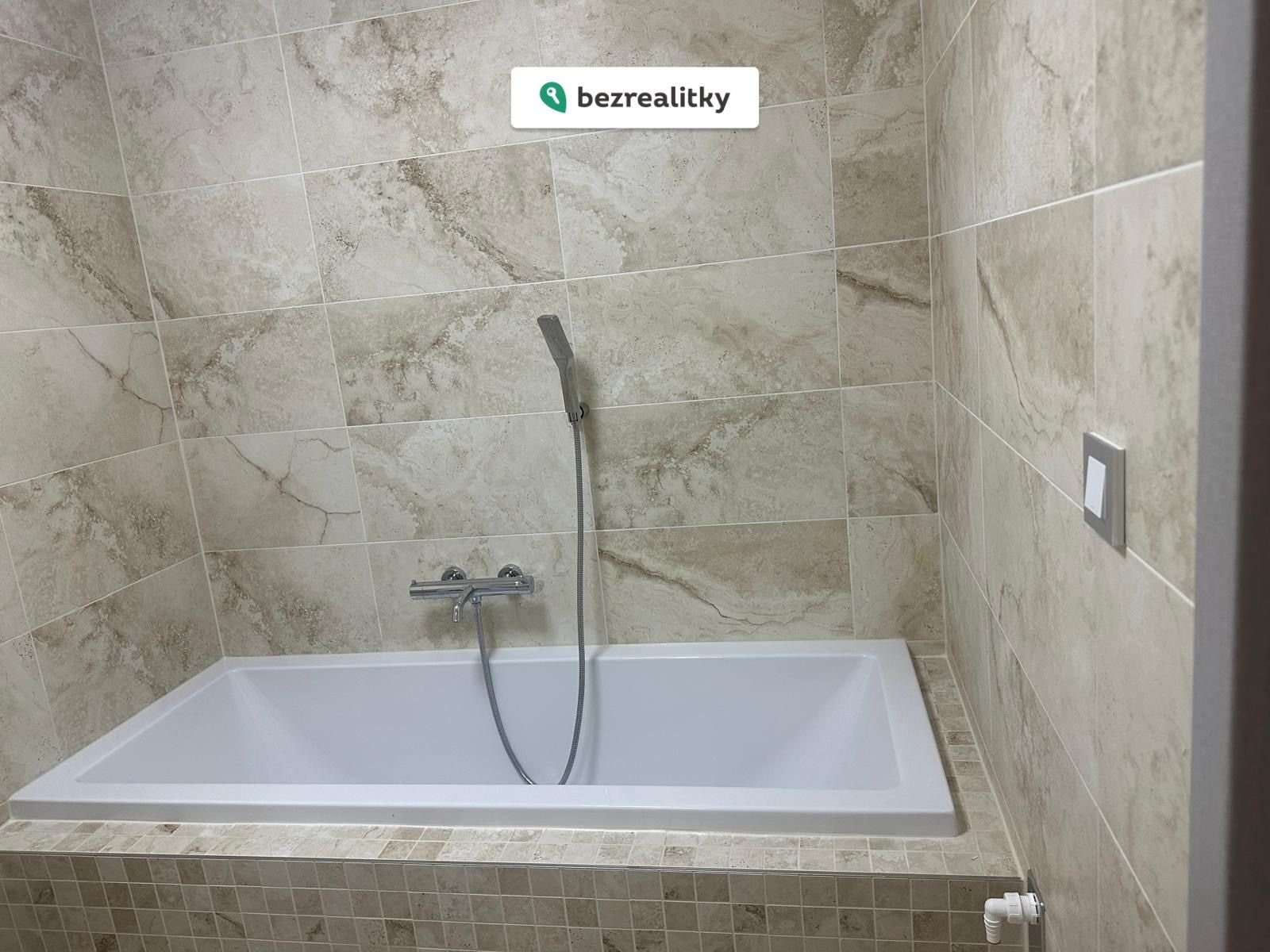 nově obložená koupelna s vanou a nástěnným záchodem se skrytou splachovací nádržkou Geberit;
