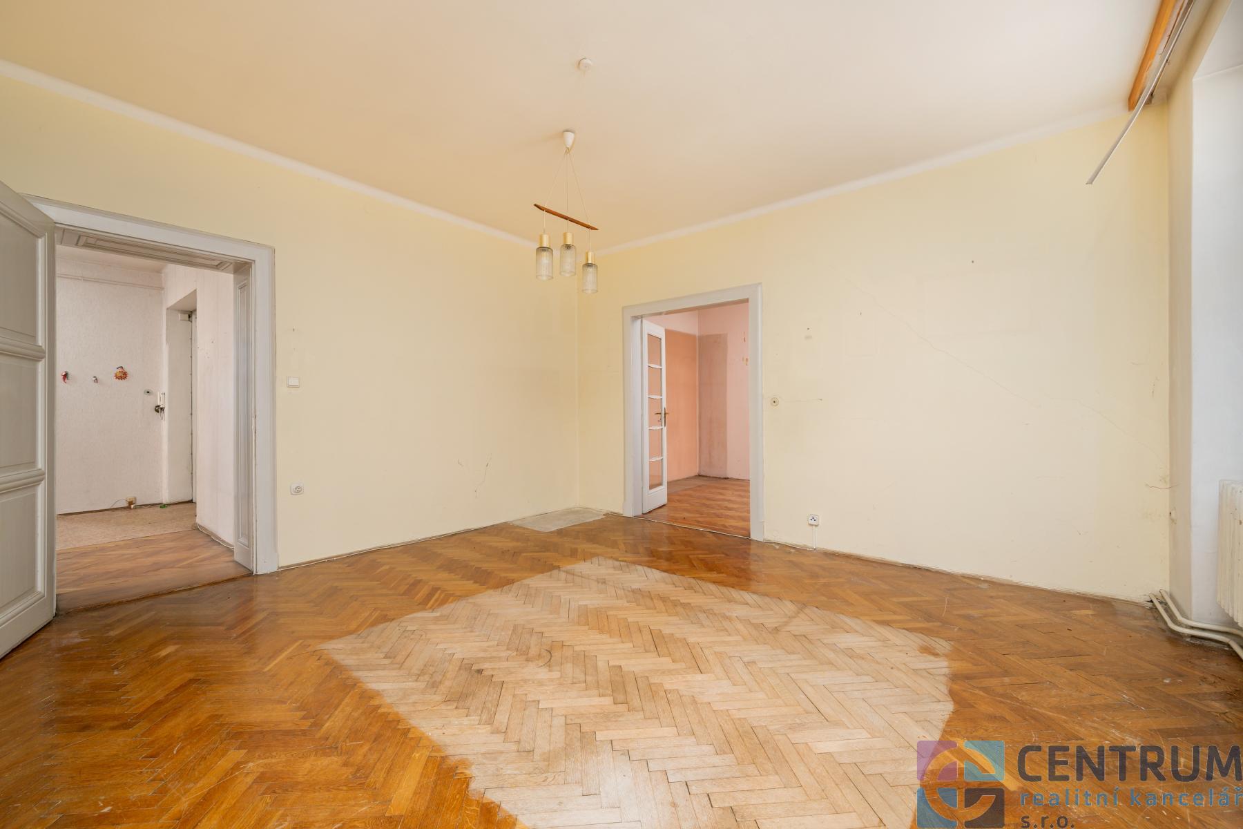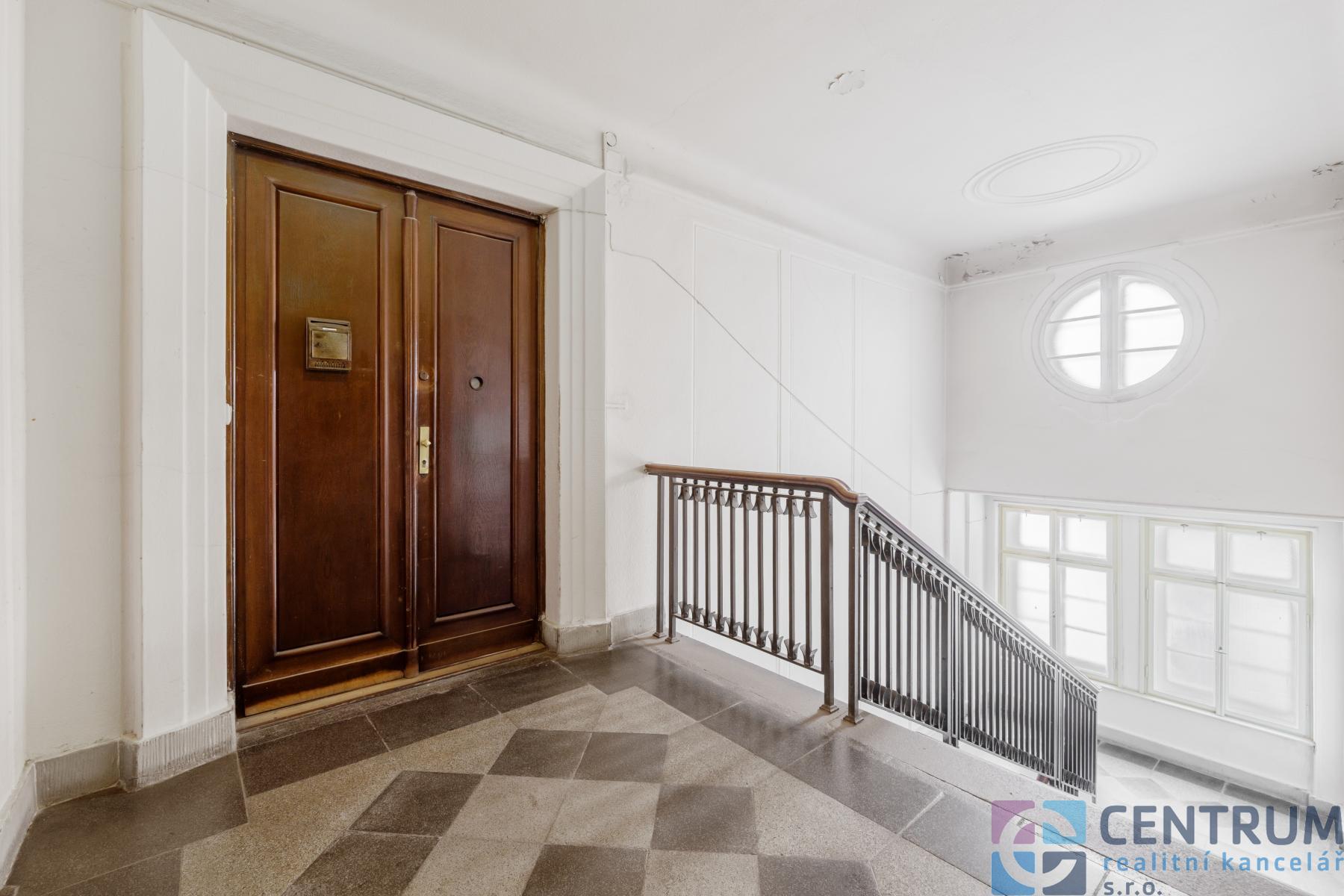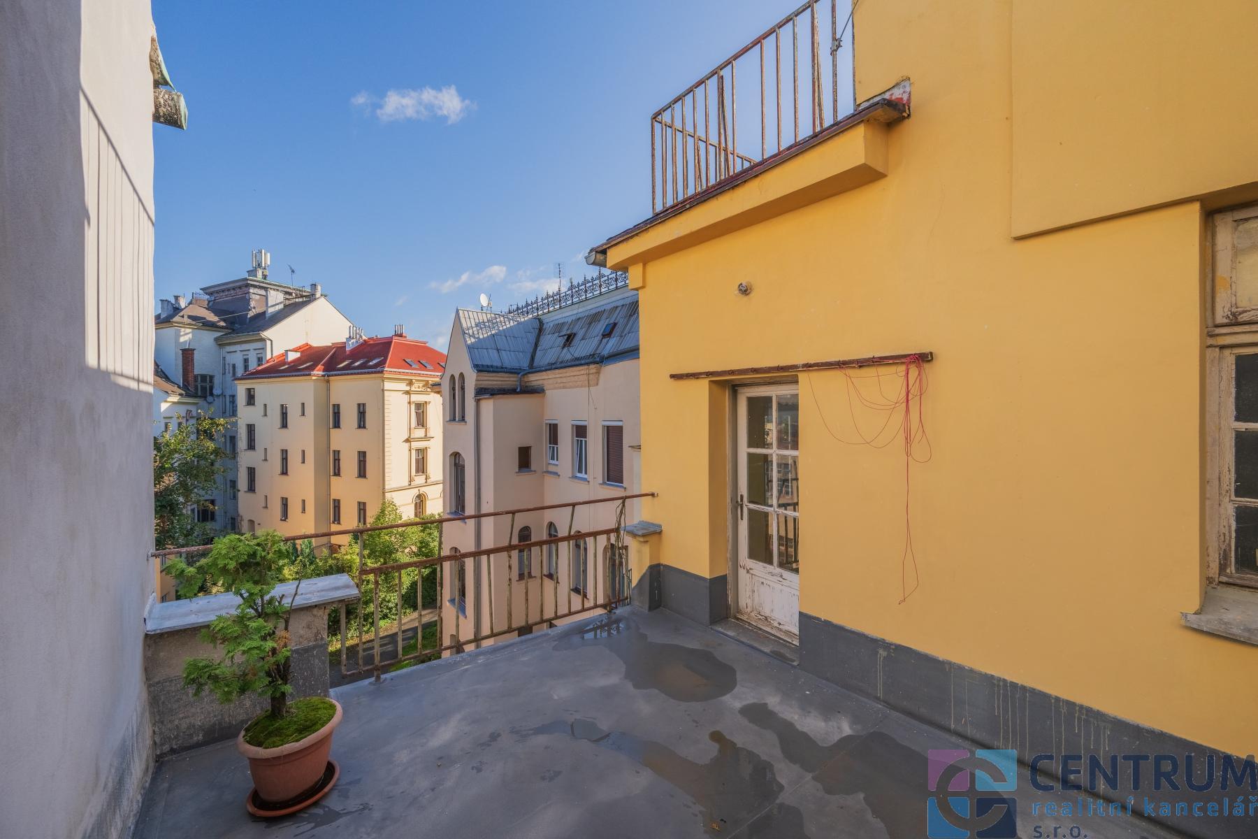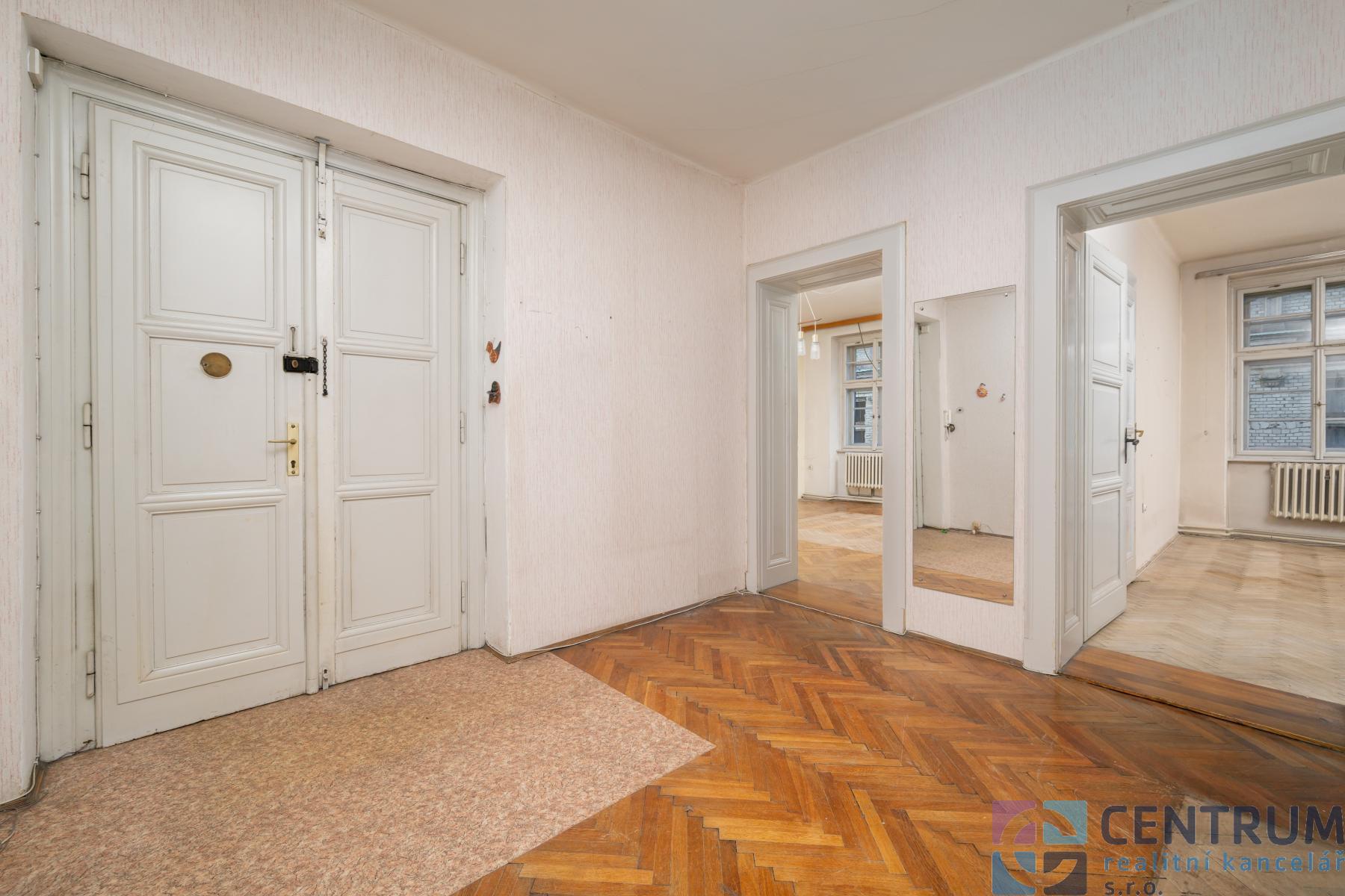 Za vstupními dveřmi nás čeká prostorná předsíň, ze které je vlevo přístup do čtyř velkých pokojů s parketami a okny na jih, rovně do prostoru sociálního zázemí koupelny a samostatné toalety, kdy koupelna je přístupná zároveň z jednoho z pokojů a vpravo do kuchyně, na kterou přímo navazuje spíž a menší pracovna se vstupem na terasu. S ohledem na původní stav bytu se v rámci rekonstrukce nabízí několik variant budoucího uspořádání. Můžete ponechat luxusní 4+1, vybudovat velké 6+kk, nebo třeba 2 byty. Střešní terasa je příjemným bonusem! S celým průběhem realizace umíme pomoci - od návrhu po dokončení - ozvěte se a zjistěte více o této možnosti!