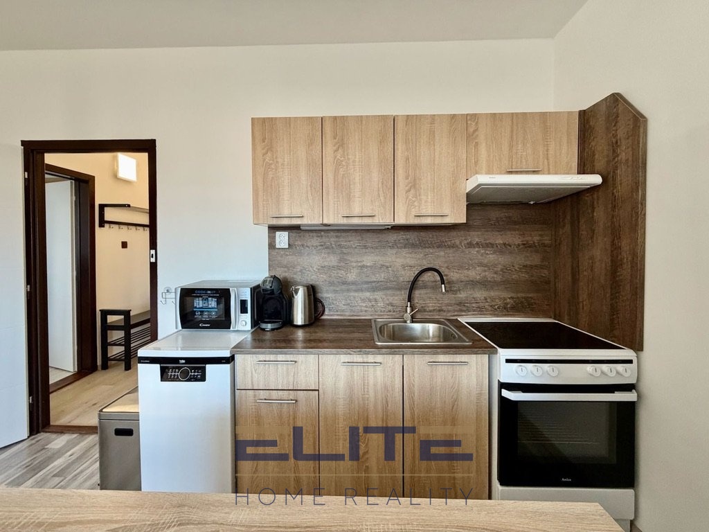 Kuchyňská linka je plně vybavena spotřebiči a byt je pronajímán kompletně zařízený, takže poskytuje komfortní bydlení bez nutnosti dalších investic.