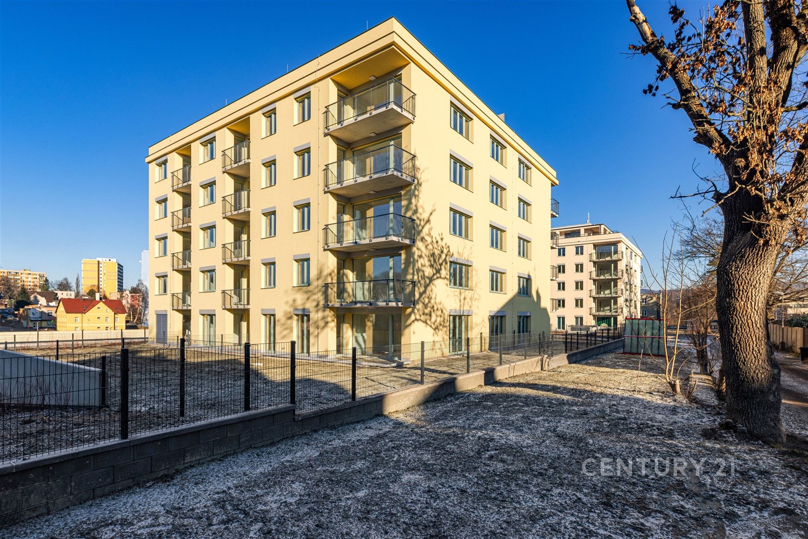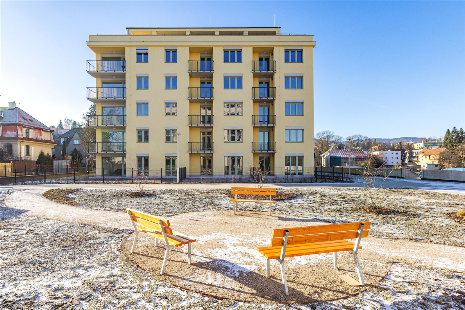 Celý areál je nově budovaný a součástí bydlení je i příjemný vnitroblok s lavičkami a zelení.