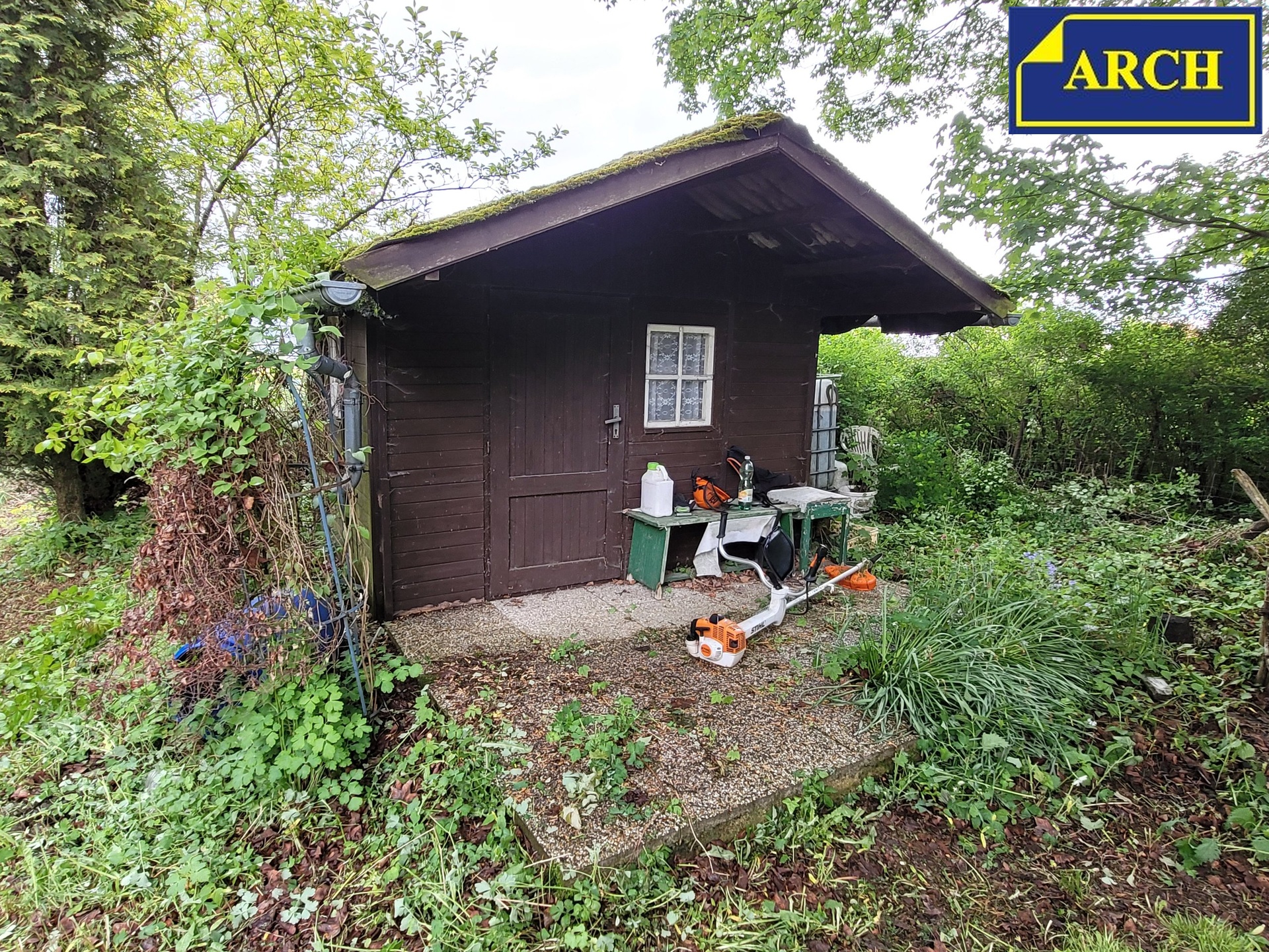Na pozemku stojí jednoduchá dřevěná chatka bez vybavení (11m2) a dřevěná kolna na nářadí. Poblíž chatky je postaven skleník z ocel. pozinkovaných profilů a vedle něho je torso starého skleníku, postaveného z velkých okurkových sklenic. Terén je mírně svažitý, se sklonem k severovýchodu.