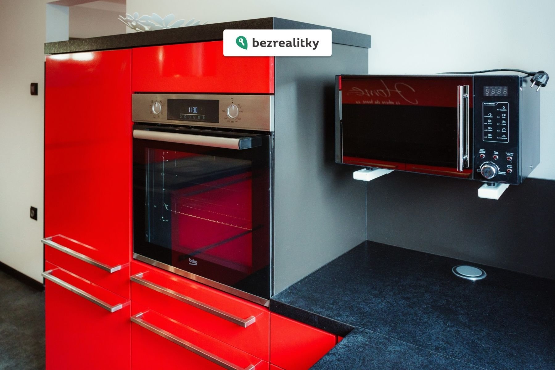 Kuchyně je vybavena kvalitní kuchyňskou linkou na míru včetně vestavných spotřebičů – trouby, mikrovlnné trouby, kávovaru a varné desky.