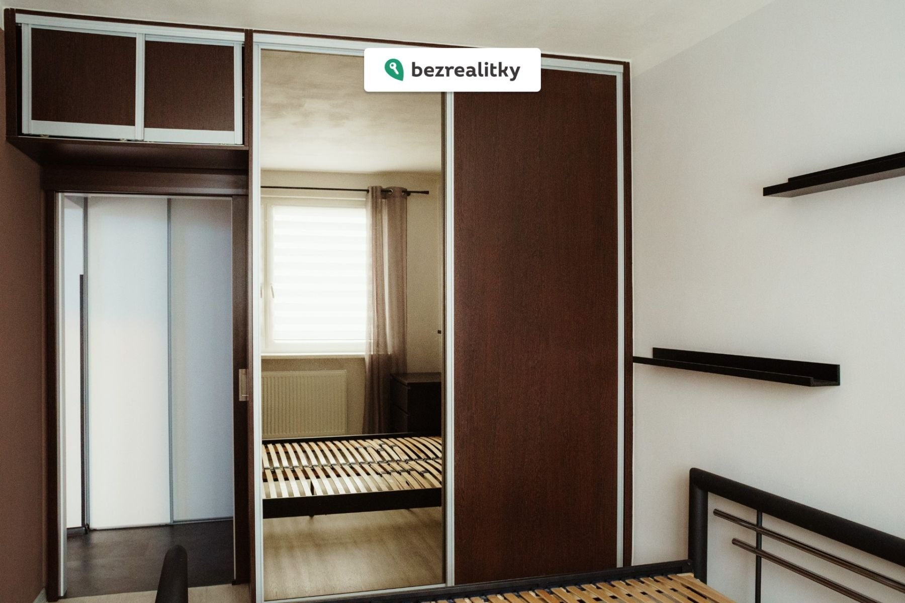 Ložnice je vybavena vestavnými skříněmi, novou postelí a TV.