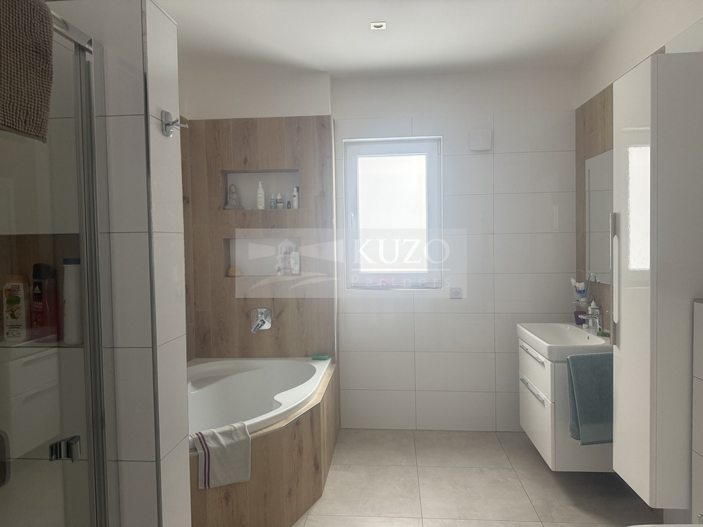 Koupelna byla vybavena špičkovými podomítkovými zařizovací předměty Hans Grohe. Najdete tu vanu i sprchový kout, dále WC a místo pro pračku i sušičku. I přes to vše, je zde stále dost volného prostoru a místnost nepůsobí přeplněně.