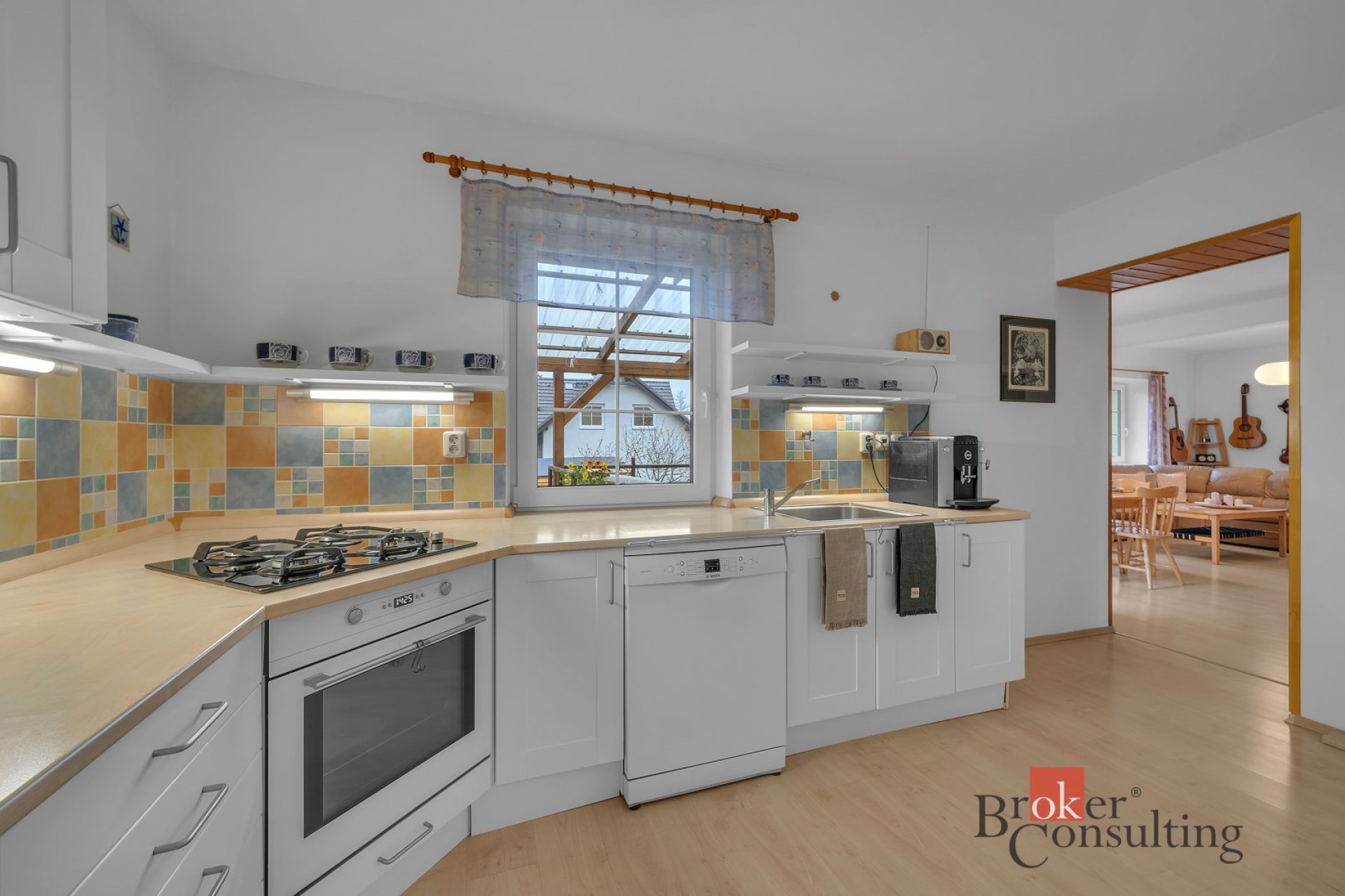 V přízemí domu naleznete prostorný a světlý obývací pokoj s výstupem na venkovní terasu, která Vám poskytne krásný výhled do zahrady. Součástí přízemí je moderní kuchyňský kout a jídelna. Kuchyňská linka je vybavena dvěma troubami a plynovým sporákem na PB, s keramickou deskou a myčkou. Dále zde najdete ložnici s vestavěnou skříní a koupelnu s vanou a samostatným WC.