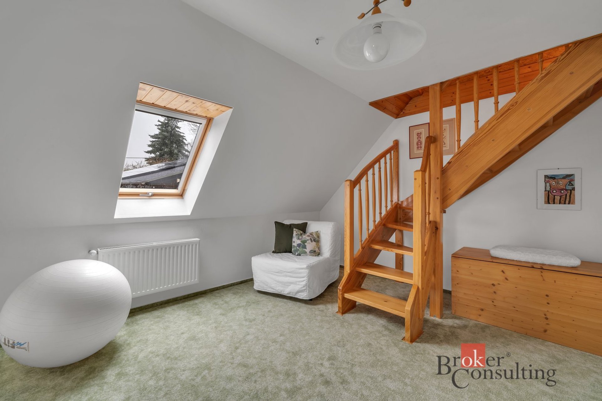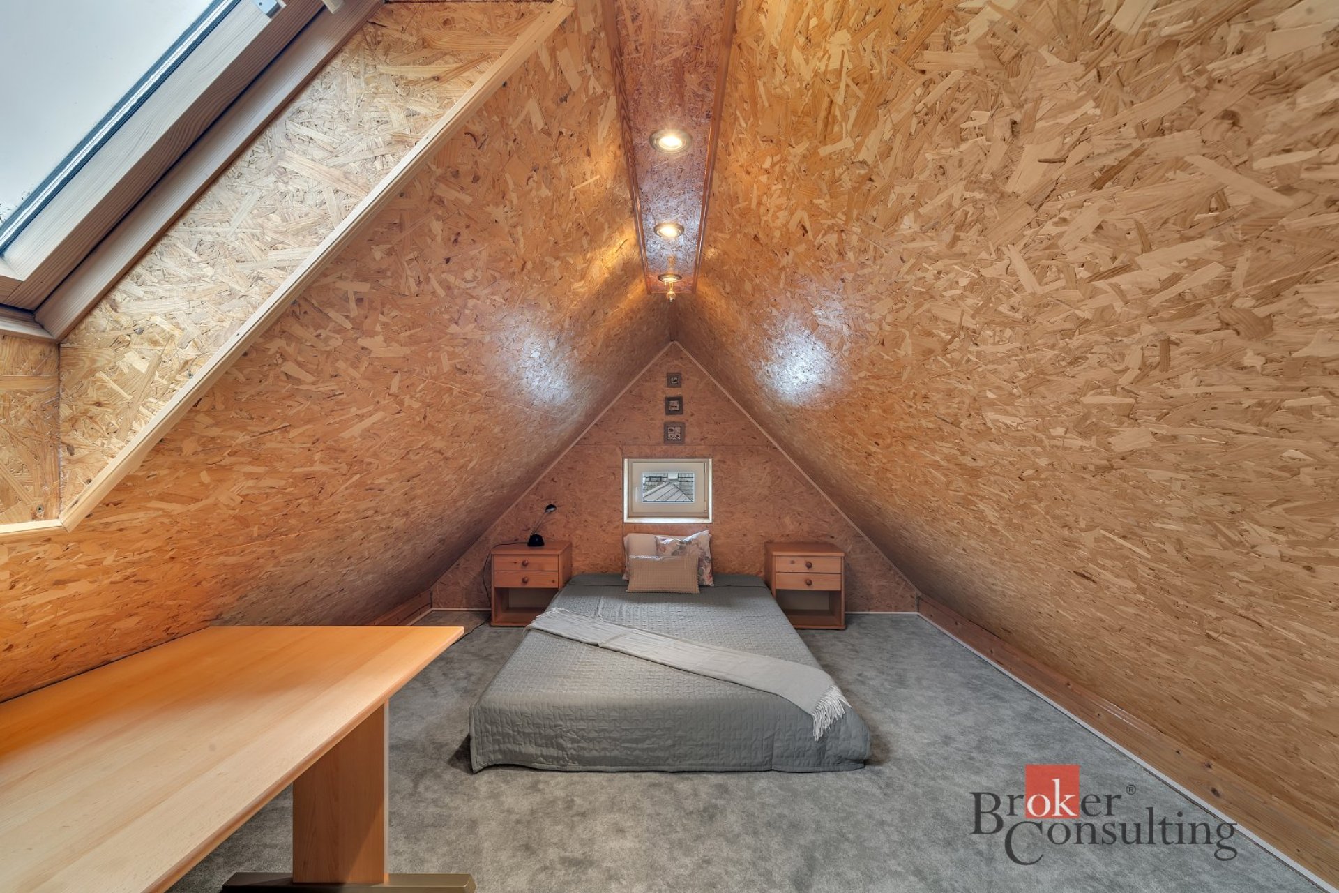 V patře domu se nacházejí dva dětské pokoje, pracovna a koupelna se sprchovým koutem a WC. Z jednoho dětského pokoje je vstup do útulného obytného podkroví.
