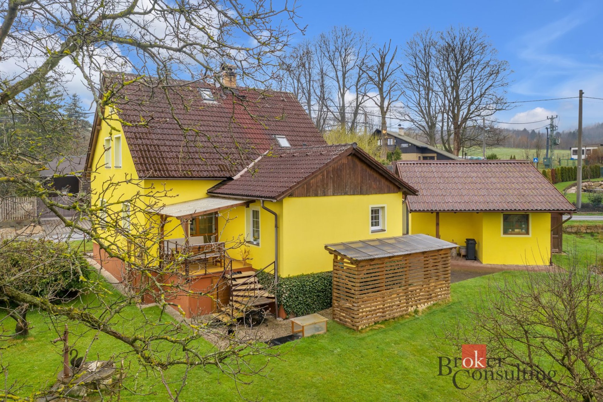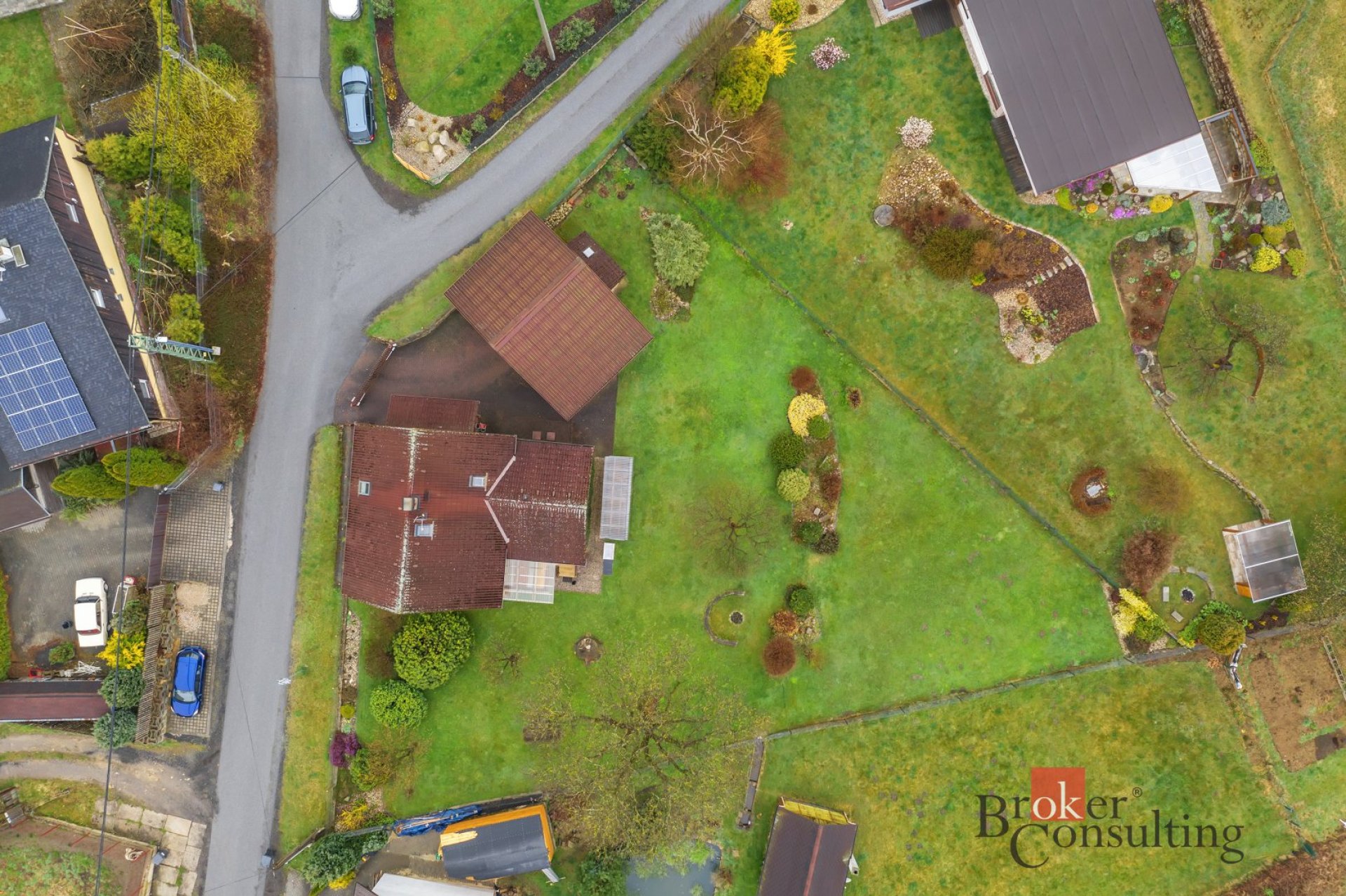 Součástí dvoupodlažního rodinného domu je velká a mírně svažitá zahrada, samostatná dvougaráž s dílnou, technická místnost se zahradním nářadím, vlastní studna a dvoukomorová žumpa. Příjezd k domu je po zpevněné komunikaci, kde je možnost dalšího venkovního stání pro jedno auto. Brána a vrata do garáže jsou opatřena elektrickými pohony.