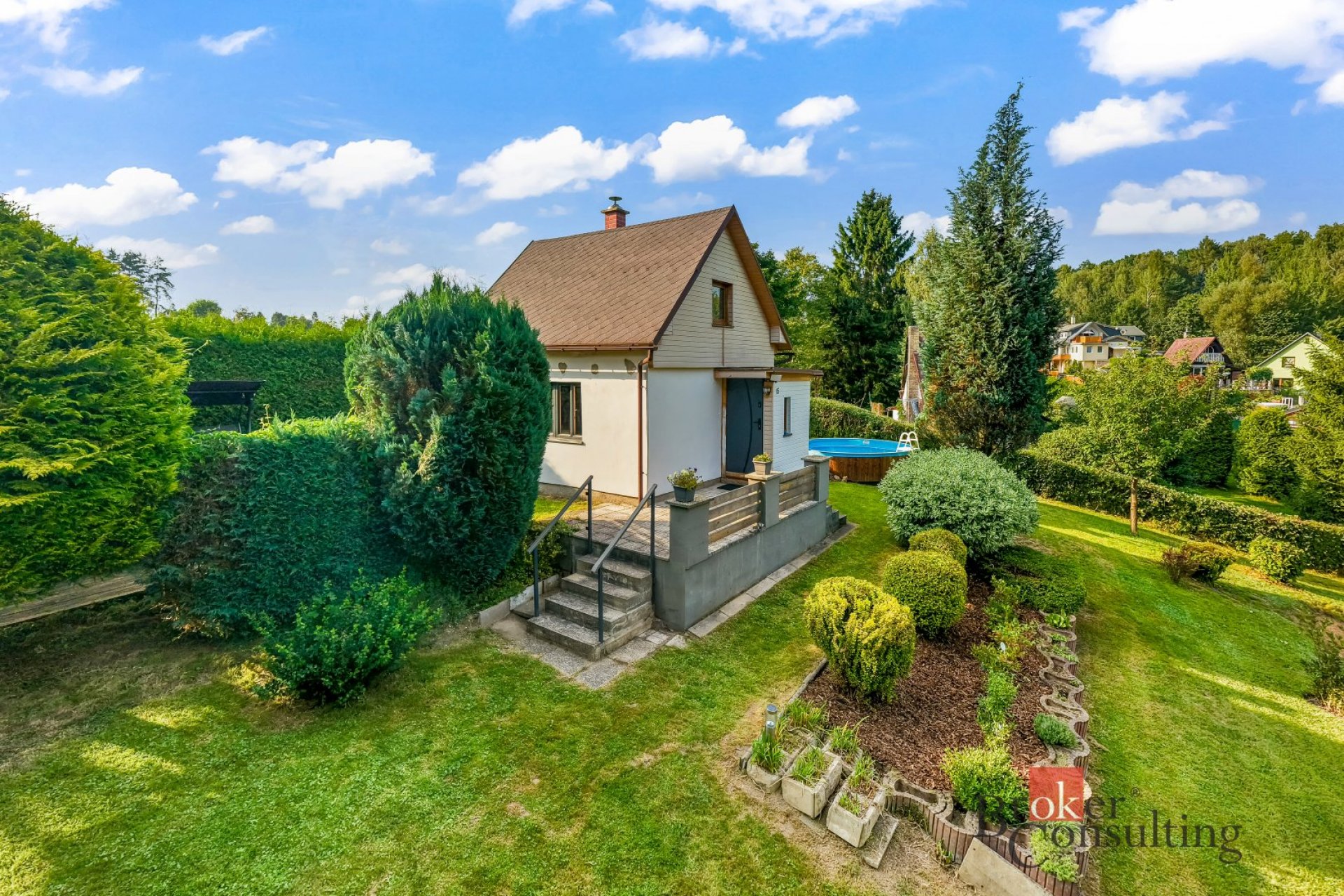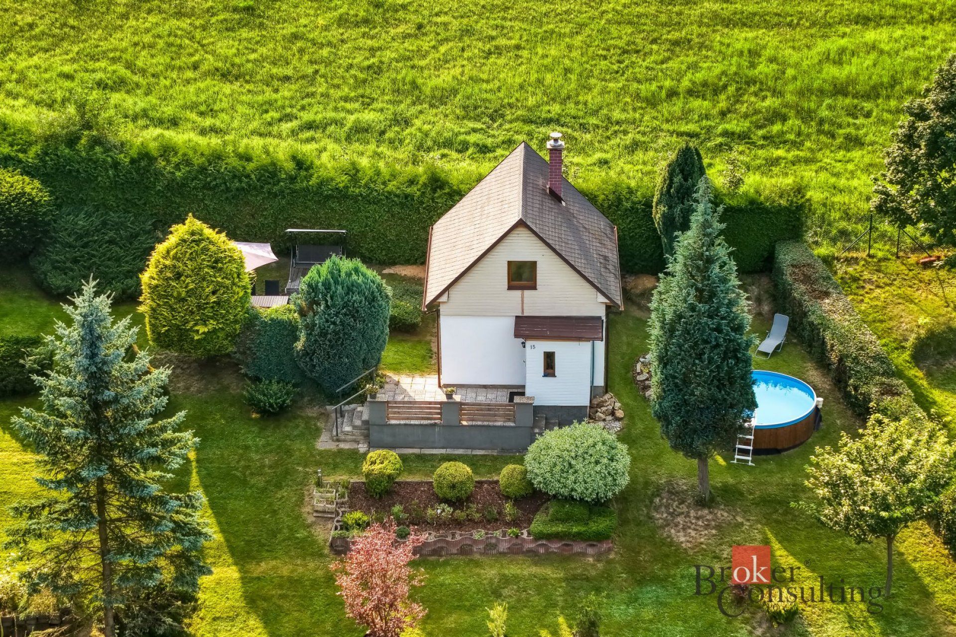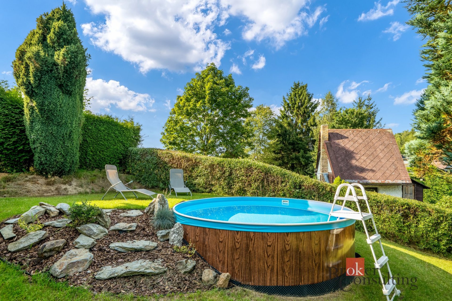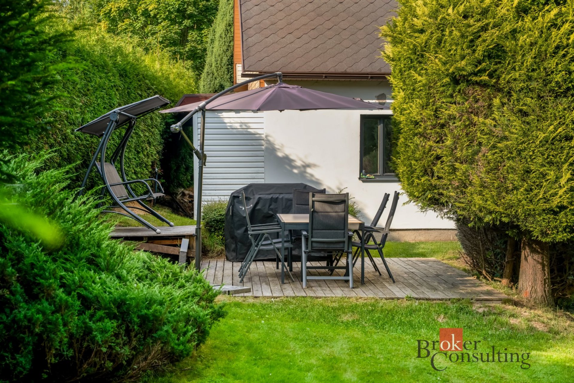 Udržovaný pozemek o celkové výměře 1470m2 nabízí plnohodnotné zázemí pro rodinný život - venkovní terasa, bazén, venkovní úložné prostory apod.