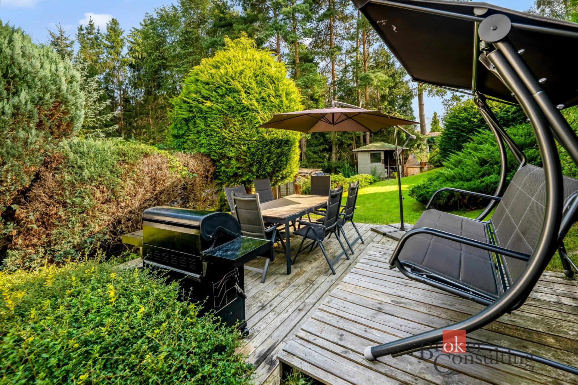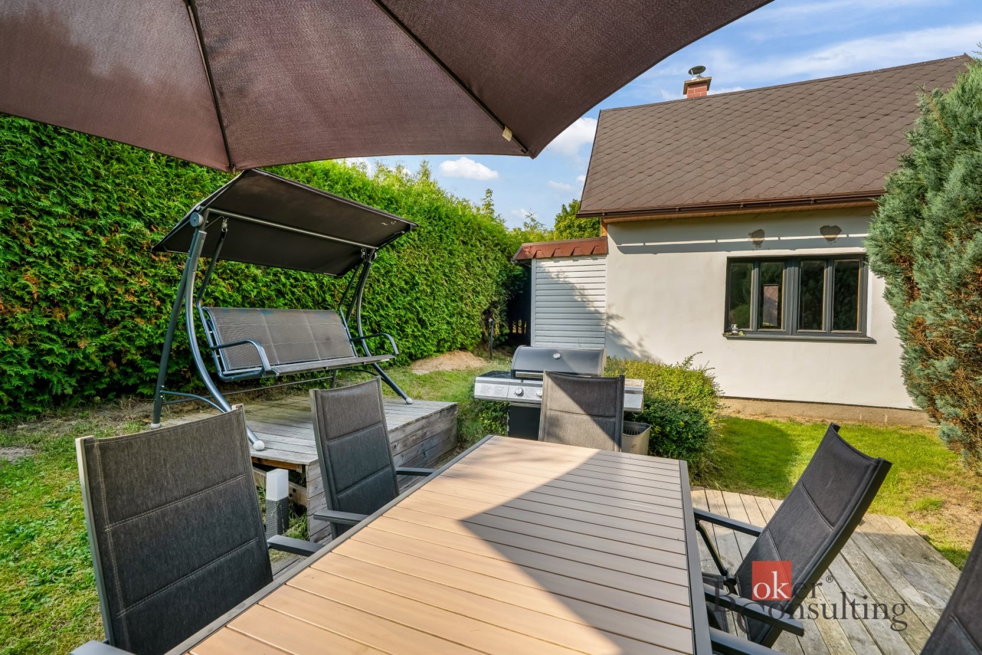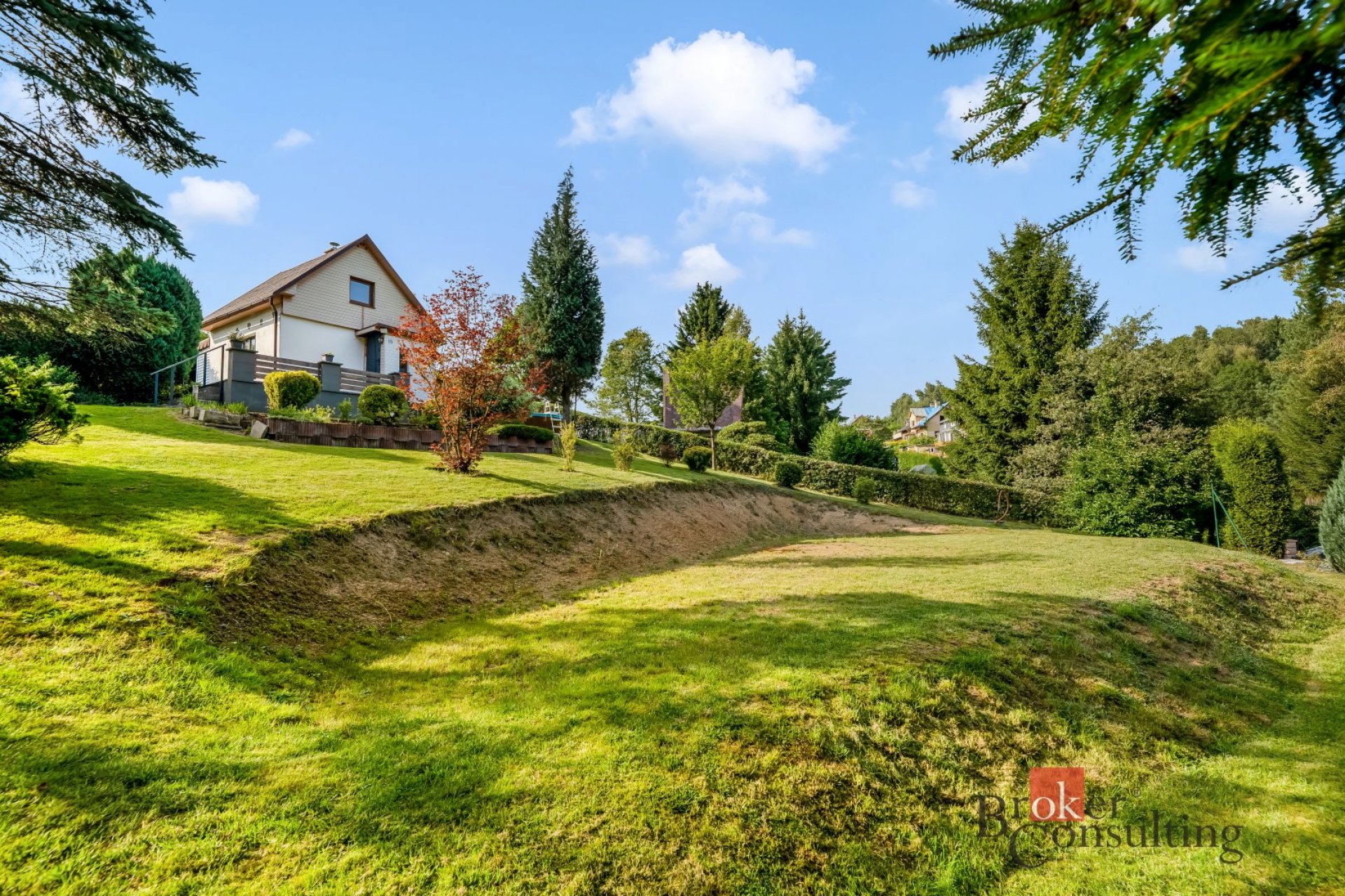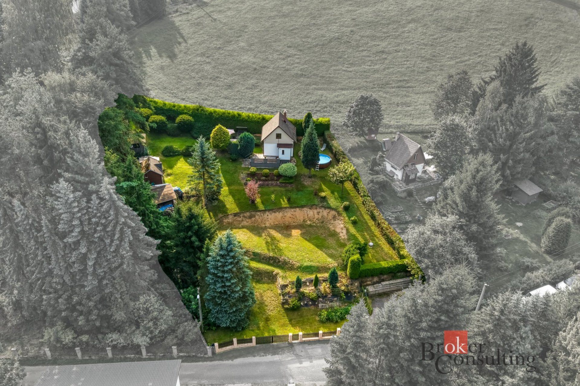 Udržovaný pozemek o celkové výměře 1470m2 nabízí plnohodnotné zázemí pro rodinný život - venkovní terasa, bazén, venkovní úložné prostory apod.