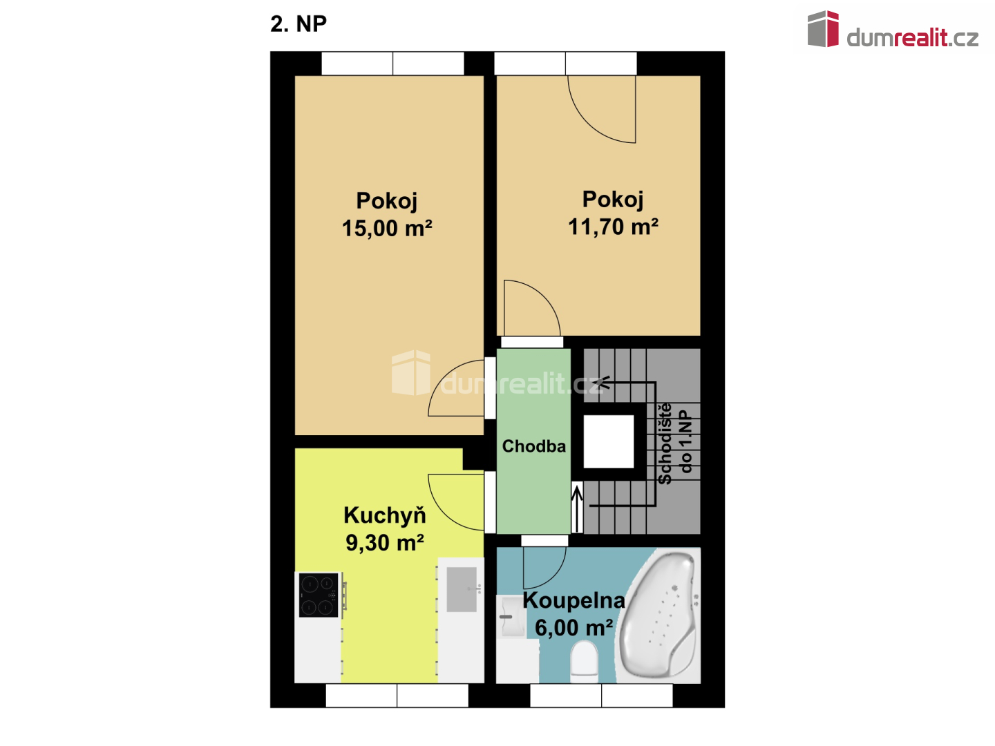 Původní dispozice domu byla 4+1 s kuchyní umístěnou v 1. nadzemním podlaží. V současnosti je kuchyň i ve 2. nadzemním podlaží, což mění dispozici na 3 pokoje a 2 kuchyně. V 1. NP se nachází obývací pokoj s výstupem na předzahrádku, kuchyň a WC. Ve 2. NP je koupelna společná s WC, kuchyň a dva pokoje. Původně byl z jednoho pokoje vstup na balkón, který byl zrušen, avšak existuje možnost jeho opětovného vybudování.