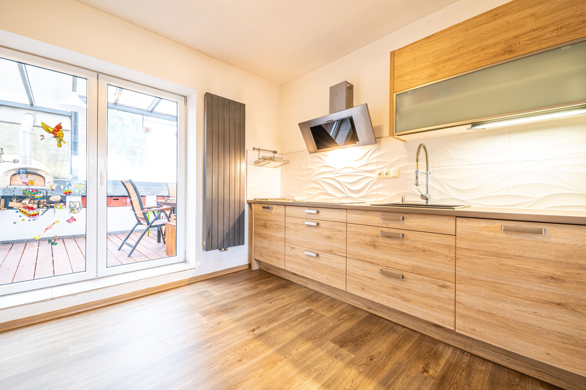 Gastronomické zážitky můžete zažít na vlastní terase. Dominantou venkovního prostoru je zastřešená terasa vybavená profesionální pecí na pizzu a samostatným grilem. K domu náleží menší zahrada se skleníkem, ideální pro pěstování vlastní zeleniny. Technologie a úspory - fotovoltaika zajišťuje výrobu vlastní elektrické energie.