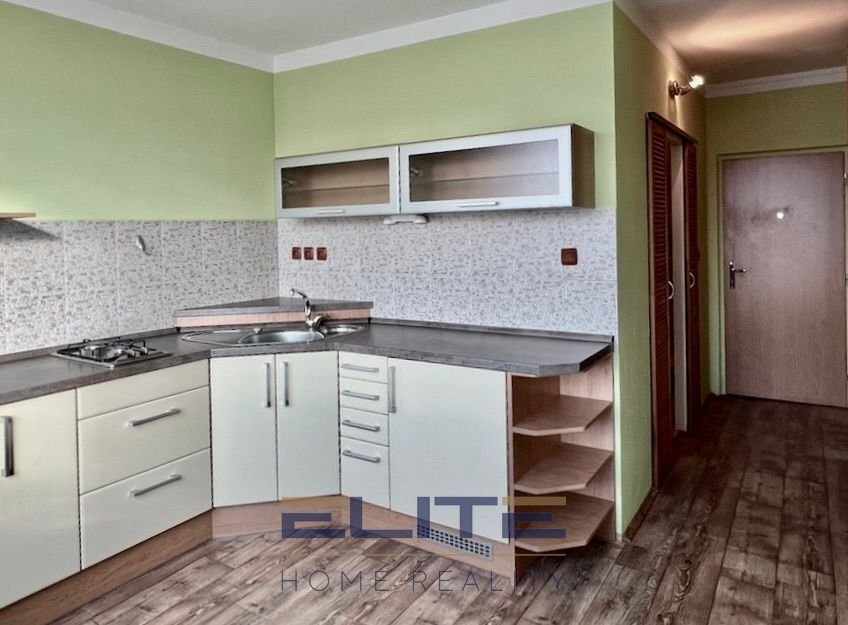 Dispozice bytu nabízí pokoj s kuchyňským koutem, který je vybaven vestavěnými spotřebiči – lednicí s mrazničkou, elektrickou troubou a varnou deskou se dvěma plynovými hořáky.