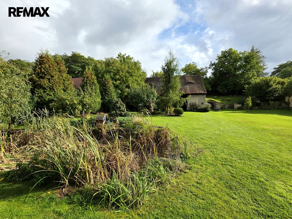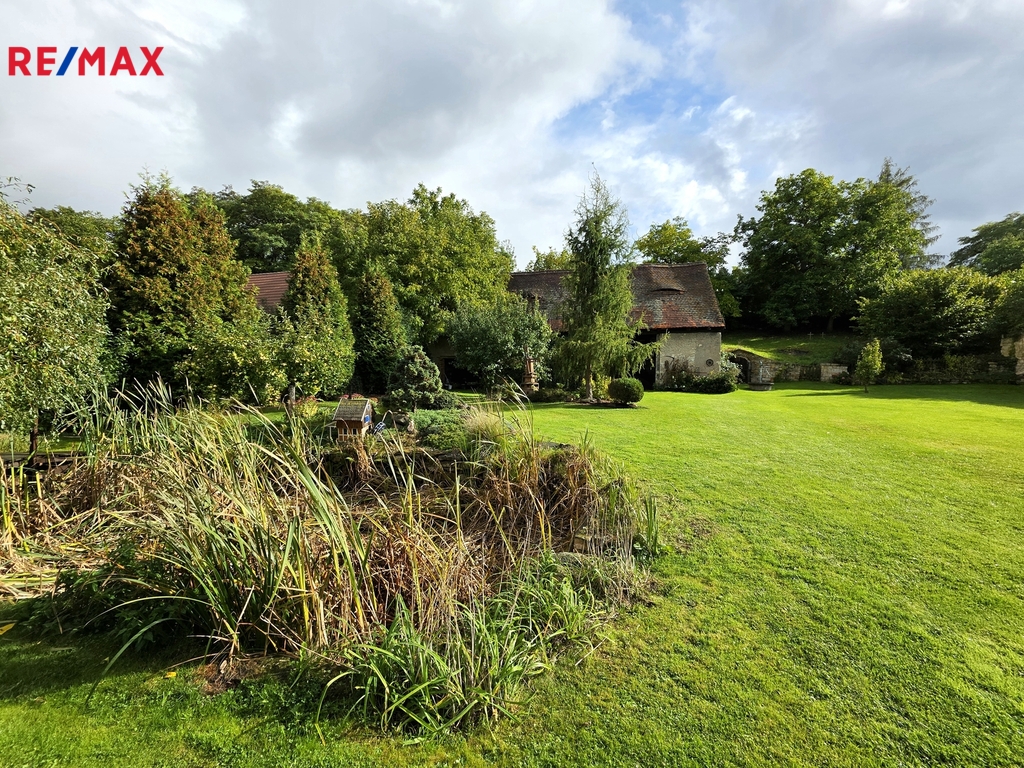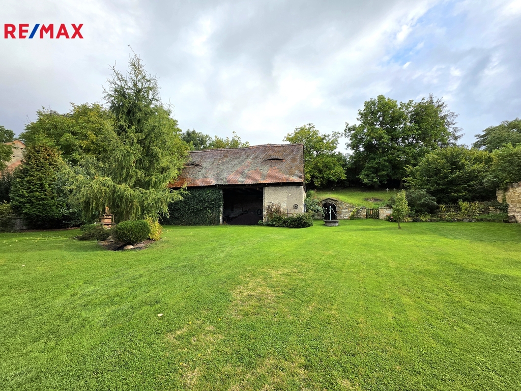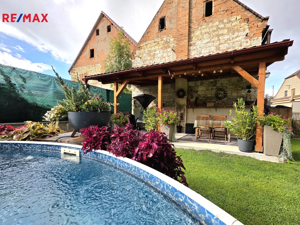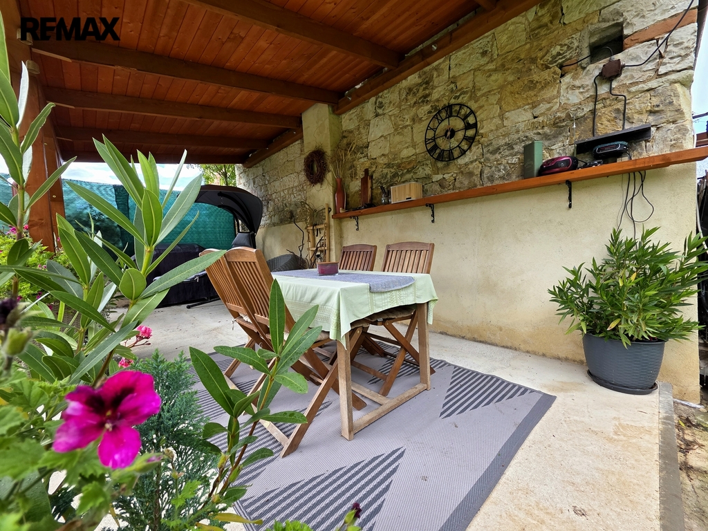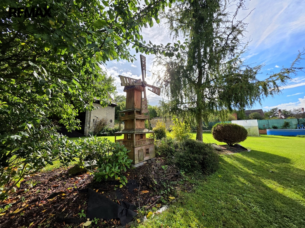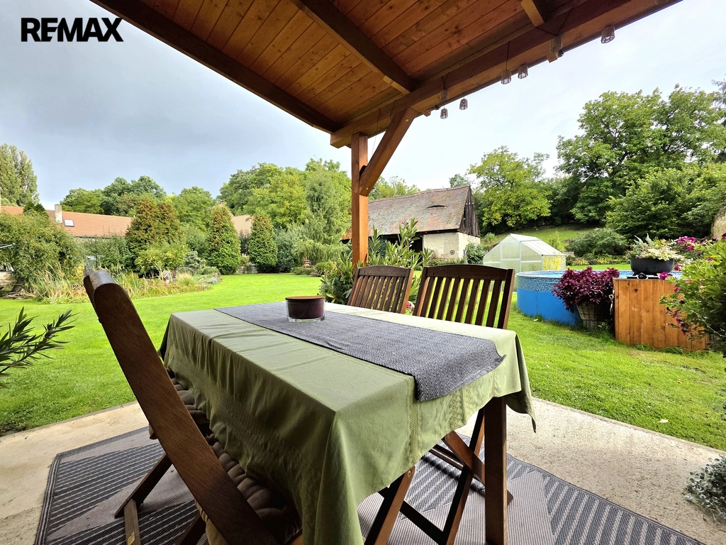 Kromě toho se na pozemku nachází kamenný sklep zasazený do svahu – ideální pro uskladnění úrody nebo vína. Zahrada má několik různých částí, kombinuje okrasnou i užitkovou část. Nechybí nově zbudovaná krytá pergola s posezením, bazén, rybníček, skleník, ani pečlivě udržované trávníky. V zadní části pozemku rostou vzrostlé ořešáky, které dotvářejí malebný obraz celého místa.