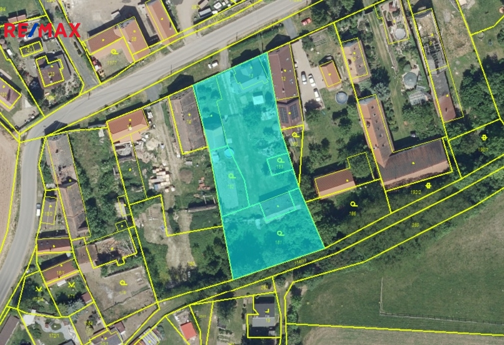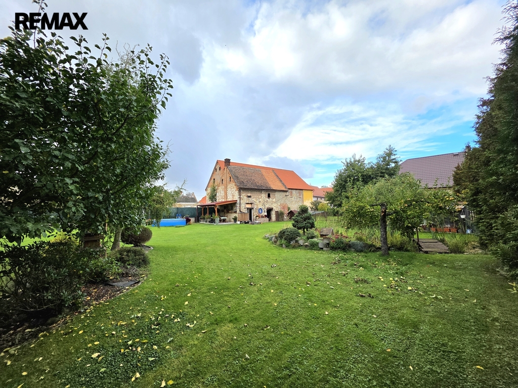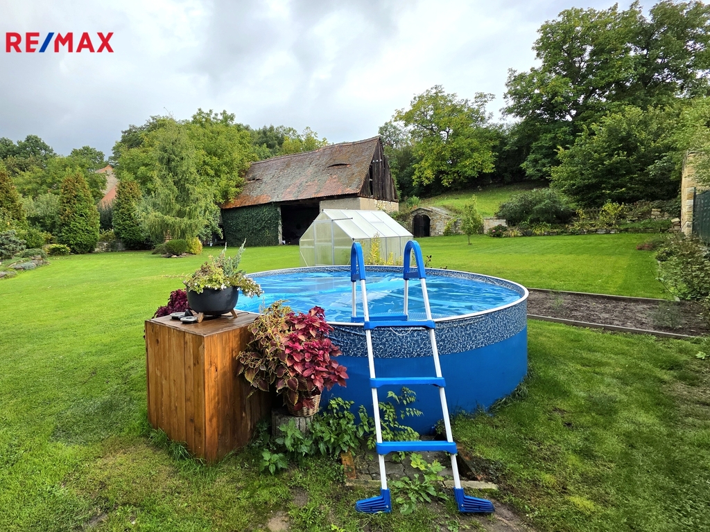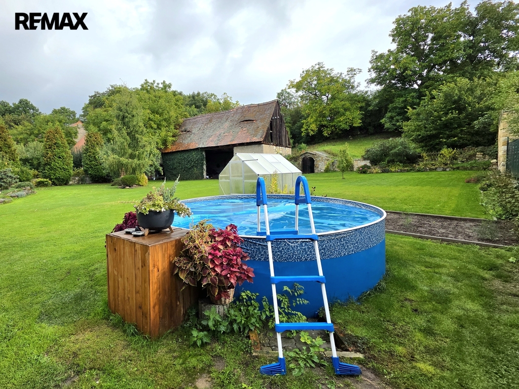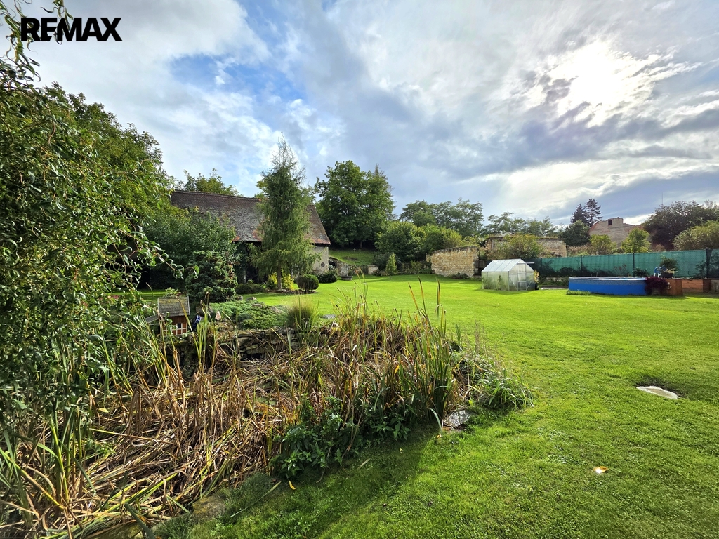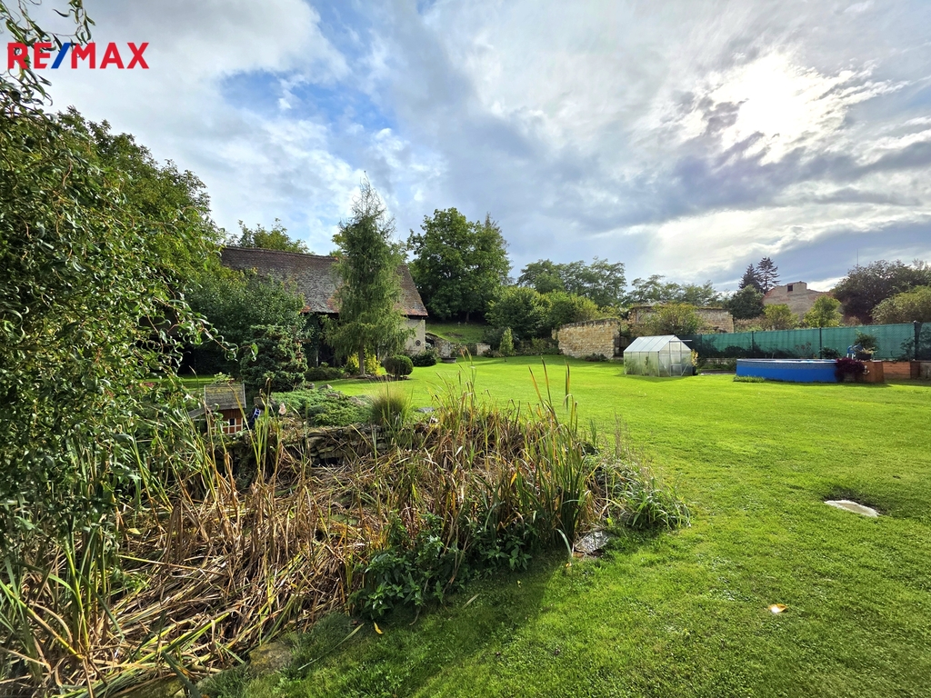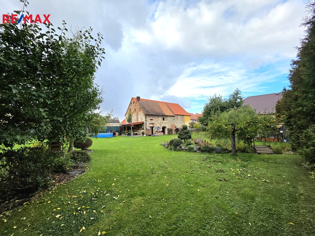 Rozlehlý pozemek o velikosti 2 651 m² (včetně zastavěné) je skutečnou oázou klidu. Z větší části je rovinatý, v zadní části svažitý. Najdete zde další dvě samostatné budovy – stodolu s garáží a hospodářskou budovu. Ve stodole se nachází studna, kterou je možno použít jako zdroj užitkové vody pro splachování, sprchování, pračku. Hospodářská budova je nyní využívána jako letní kuchně a skladovací prostory.