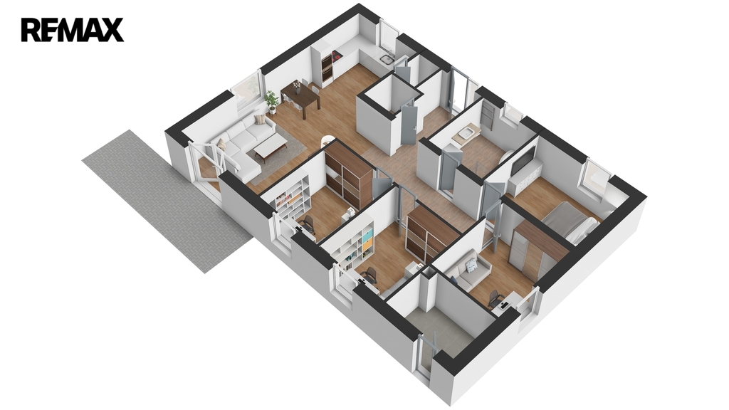 Dispozice domu nabízí obývací pokoj s kuchyňským koutem, čtyři samostatné pokoje, koupelnu, samostatné WC, technickou místnost a spíž. Řešení je ideální pro rodinu s dětmi i pro kombinaci bydlení a práce z domova.