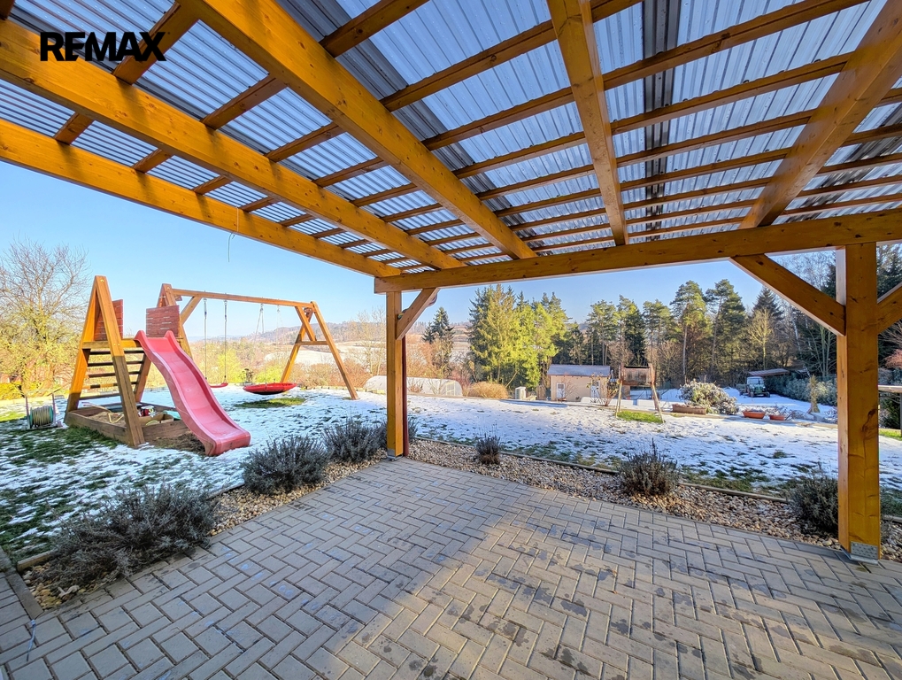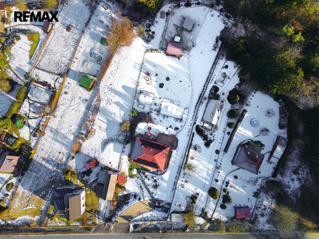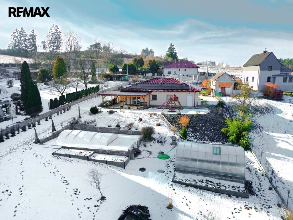 Pozemek je svažitý se sklonem k východu, oplocený a poskytuje vysokou míru soukromí. K dispozici je terasa cca 54 m², krytý vyhřívaný bazén 18 m² se slanou vodou a protiproudem, zahradní domek 20m², skleník 3×6 m, vyvýšené záhony, hospodářské zázemí, přístřešek, kotec a ovocné stromy (jabloň, švestka, třešeň, ořešák). Parkování až pro 6 vozidel.