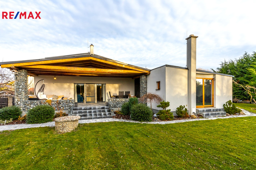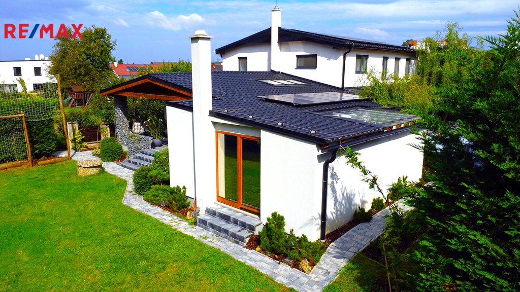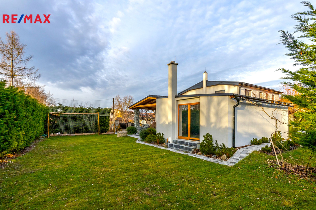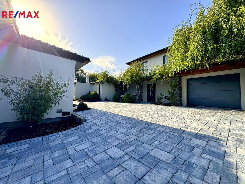Prodej nadčasového domu s vlastním wellnessem, domem pro hosty a garáží v okrese Praha-Východ.