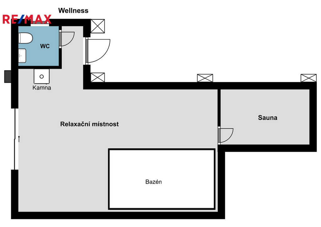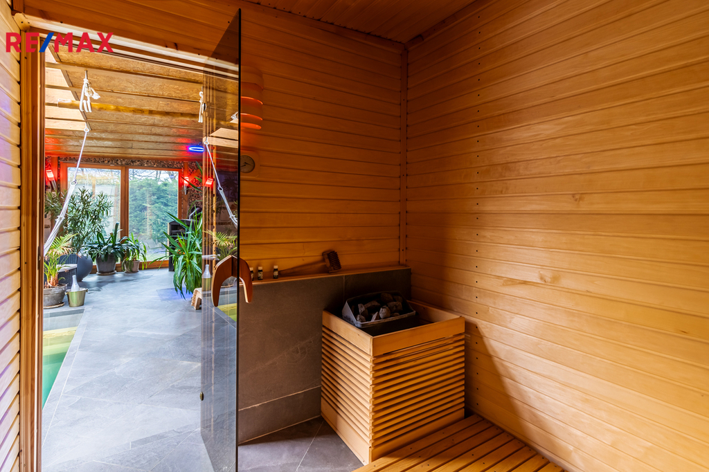 Wellness část nabízí krásných 45 m². Nachází se zde bazén se slanou vodou (vyhřívaný) a na míru dělaná sauna. Nechybí ani otevřená sprcha a krbová kamna.