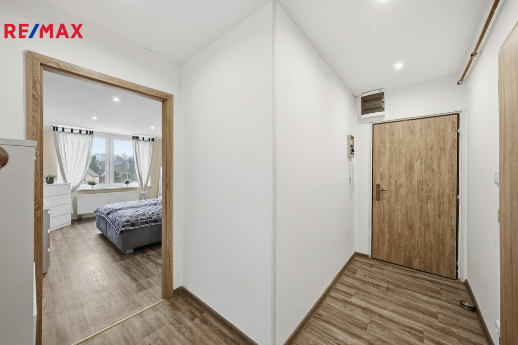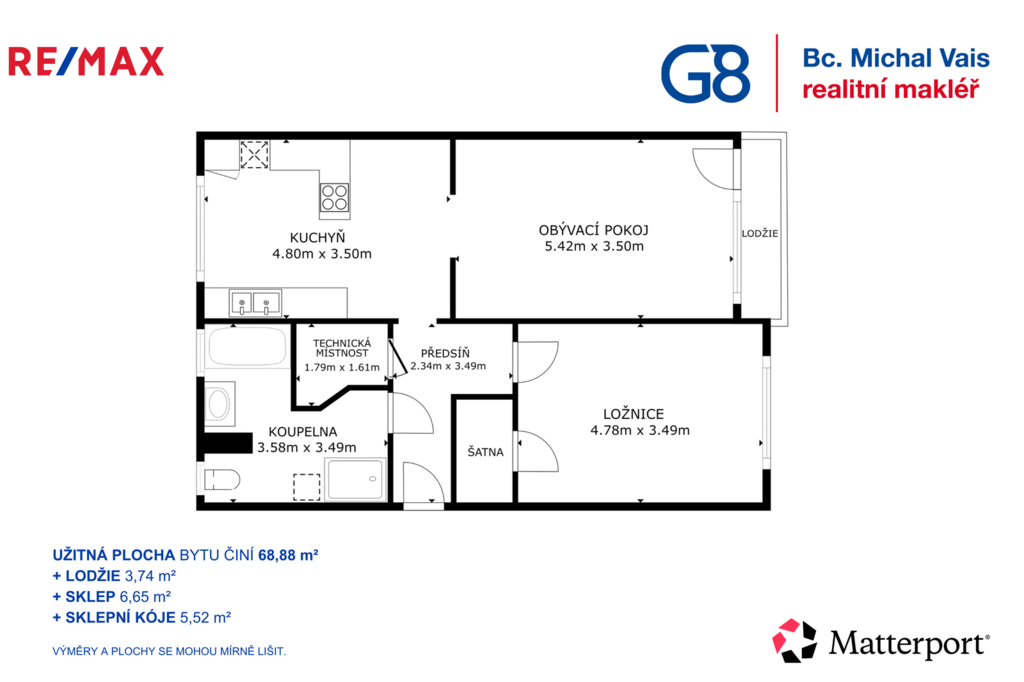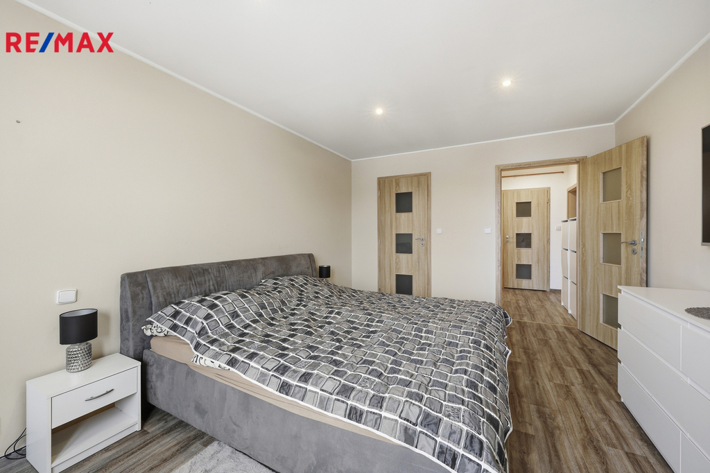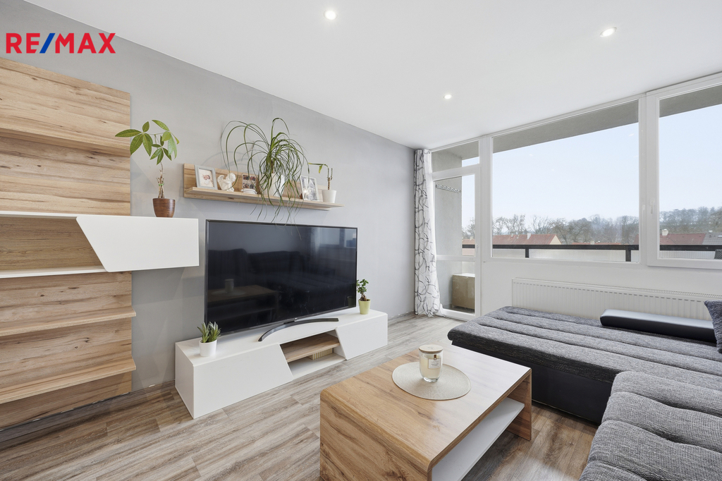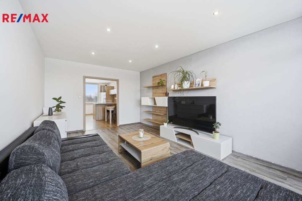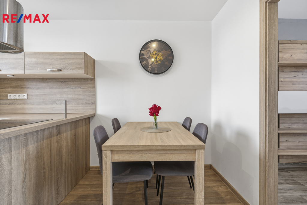 Byt prošel kompletní rekonstrukcí a je připraven k okamžitému užívání. Dispozice je řešena velmi prakticky – kuchyň s jídelním koutem a novou kuchyňskou linkou včetně vestavných spotřebičů (myčka, elektrická varná deska, trouba, mikrovlnná trouba, digestoř, lednice s mrazákem), obývací pokoj se vstupem na lodžii (3,74 m2), ložnice se šatnou, dále koupelna se sprchovým koutem, vanou a toaletou, technická místnost a komora. K bytu náleží také dva sklepní prostory (6,65 m2 a 5,52 m2), které výrazně zvyšují úložný komfort.