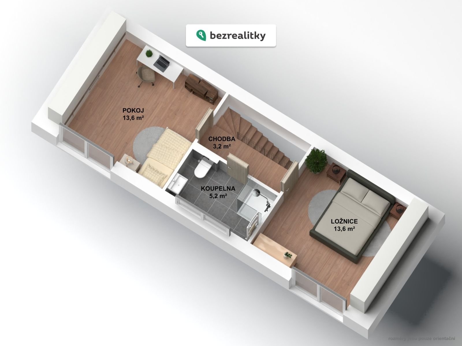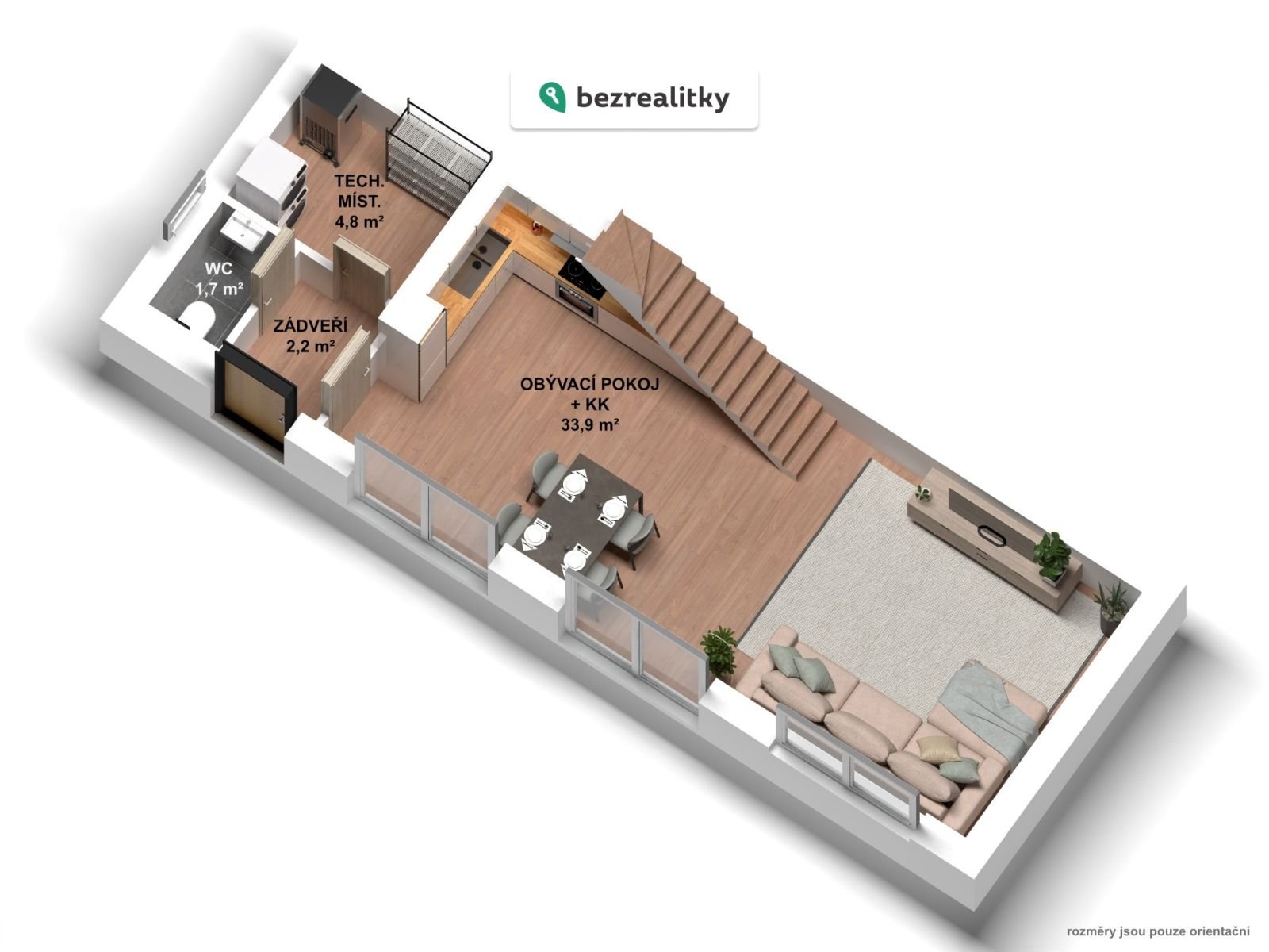 V přízemí nabízené bytové jednotky se nachází obývací pokoj s kuchyní, zádveří, technická místnost a samostatné wc. V prvním patře je ložnice, dětský pokoj, koupelna s wc.