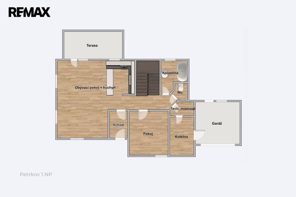 V přízemí vás přivítá srdce domova – velký obývací pokoj propojený s kuchyní, odkud je přímý vstup na zahradu a budoucí terasu orientovanou na západ. Dále tu najdete pokoj (ideální jako pracovna nebo ložnice pro hosty), koupelnu, samostatné WC a technické zázemí.