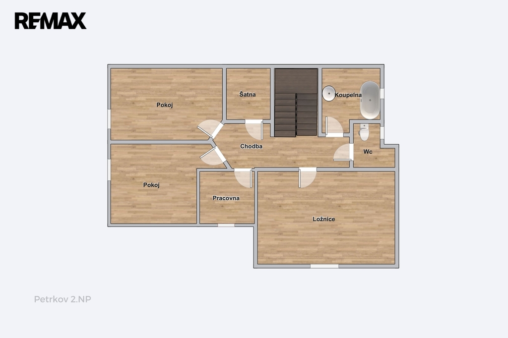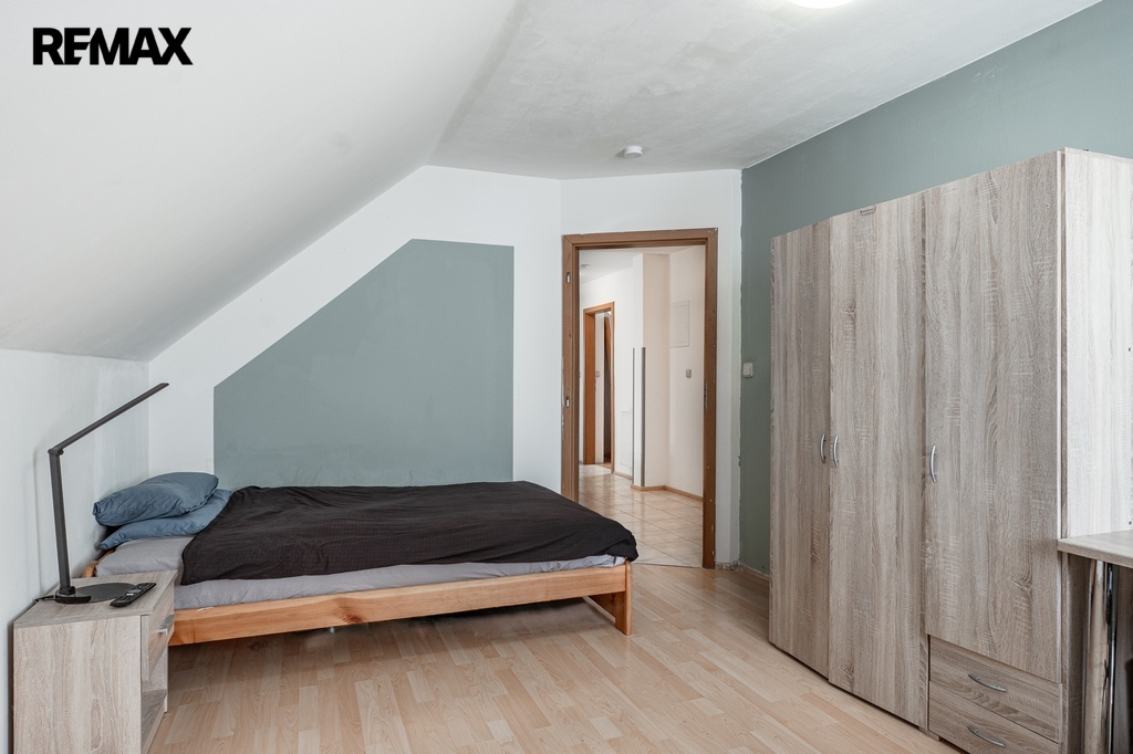 V podkroví se nachází oáza klidu se třemi ložnicemi, dalším pokojem (co takhle herna pro děti?), šatnou i druhou koupelnou a WC.