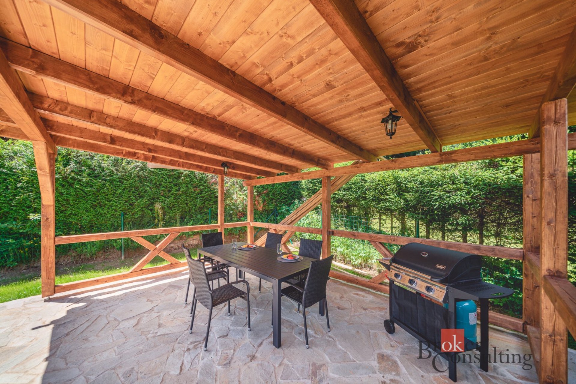 Chata je připojená na obecní kanalizaci, má svoji vlastní vodu a veškeré fungování se řeší na elektřinu. Nemovitost je po kompletní rekonstrukci, kdy se dělala nová elektřina, voda a střecha. Zahrada se oplotila, vytvořila se zde velká, zastřešená pergola s posezením a pro děti tu najdete hřiště s pískovištěm. Venku je instalována kamera, která monitoruje okolí chaty, parkoviště a vchody k chatě. Je samozřejmě ovladatelná na dálku pomocí aplikace. V domku je vytápění řešené elektrickým podlahovým topením se třemi samostatnými termostaty, které jsou ovládané každý zvlášť. Je k nim možné stáhnout aplikaci do telefonu a na dálku každému individuálně nastavit teplotu. V obývacím pokoji je prosklený designový krb, který zde slouží spíše k večerní romantice než k vytápění. Většinu vybavení domku tvoří na míru zhotovené truhlářské výrobky. Schody do patra a madlo jsou z masivního dřeva, dále zde najdeme posuvné dveře a vestavěné skříně.