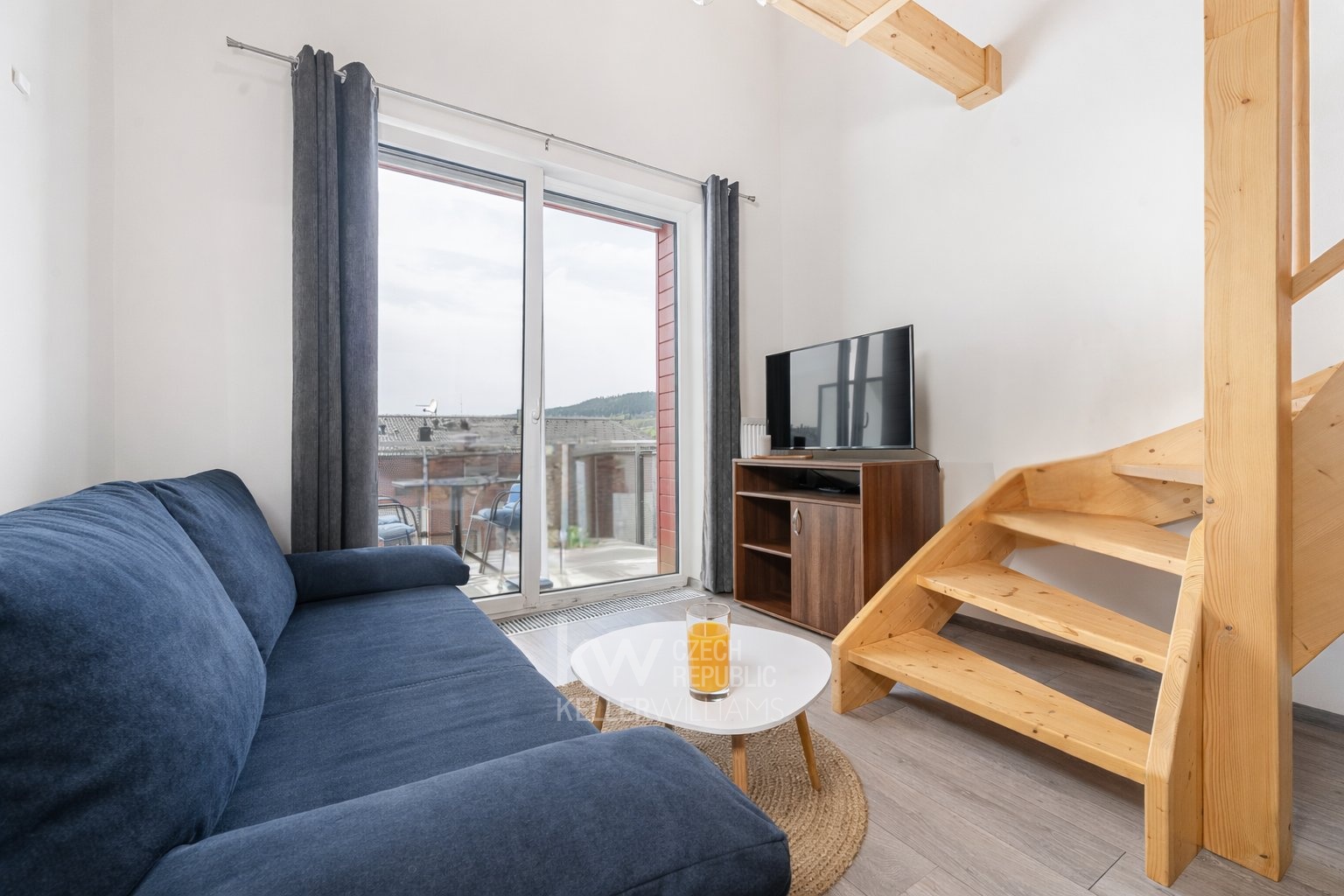 Západní orientace zajišťuje příjemné světlo po celý den. Z balkonu je výhled směrem k jezeru - ideální místo na ranní kávu i večerní sklenku vína po dni v přírodě.