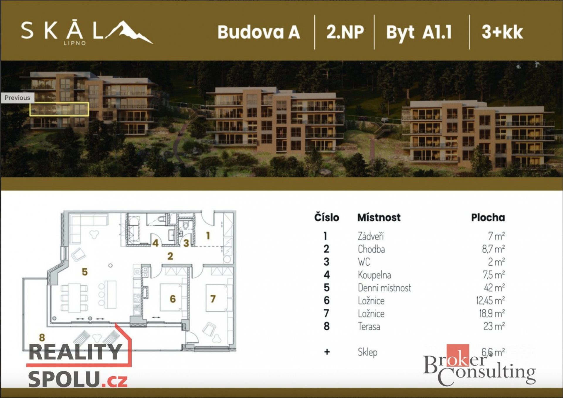 Nabízený byt: C.1.1 3+kk o celkové ploše 132m2. V této ploše je zahrnuta terasa o výměře 23m2 a sklep který má výměru 7m2. Významným benefitem je podíl na honosně vytvořených společných prostorách ve kterých naleznete lyžárnu, kolárnu, technické místnosti, další samostatné budovy jako je společenská místnost s dětským koutem, budova wellness a budova pro uskladnění sportovního náčiní k vodě. Samozřejmostí je také soukromé molo.