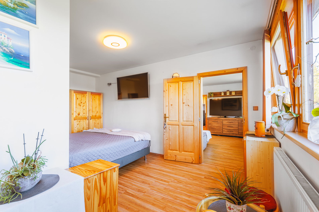 Stávající dispozice umožňuje ubytování až pro 64 hostů ve 15 stejných čtyřlůžkových pokojích, každý s vlastním sociálním zázemím a balkonem orientovaným do krajiny. Součástí areálu je také samostatný apartmán, který je nyní využíván pro personál, ale lze jej jednoduše upravit pro další hosty. Celková užitná plocha objektu přesahuje 1 200 m², parkovací plocha pojme přibližně 20 automobilů a celý areál působí čistě, udržovaně a připraveně k provozu.
