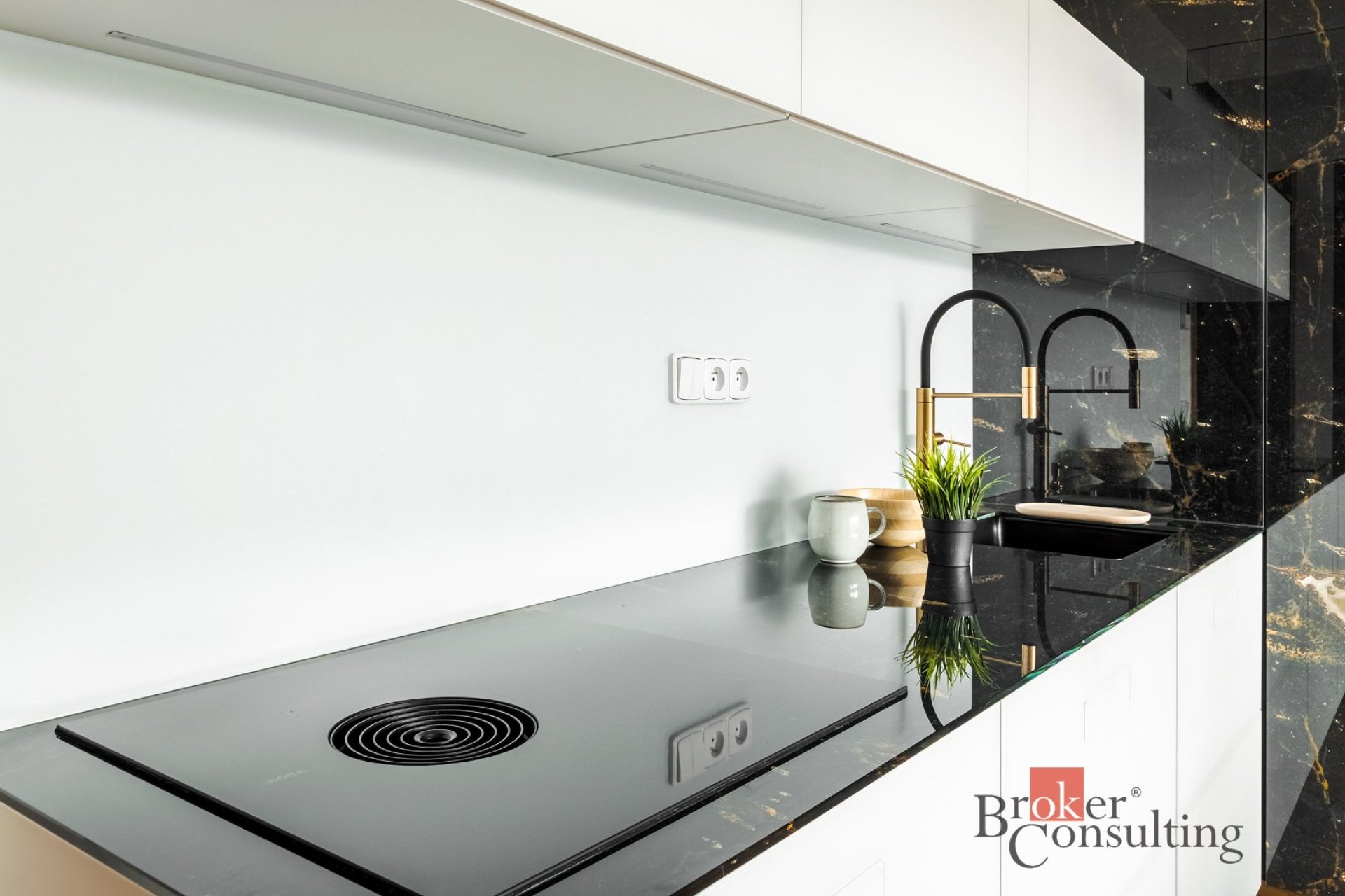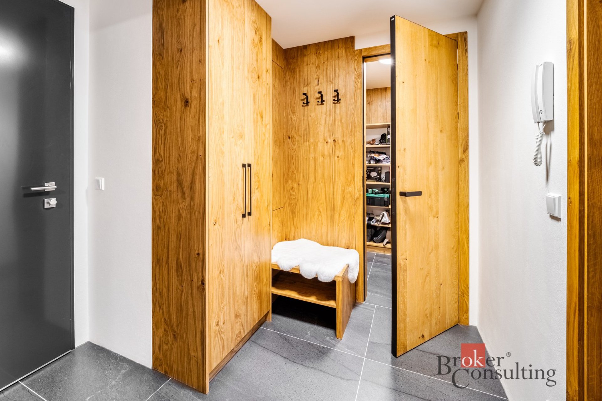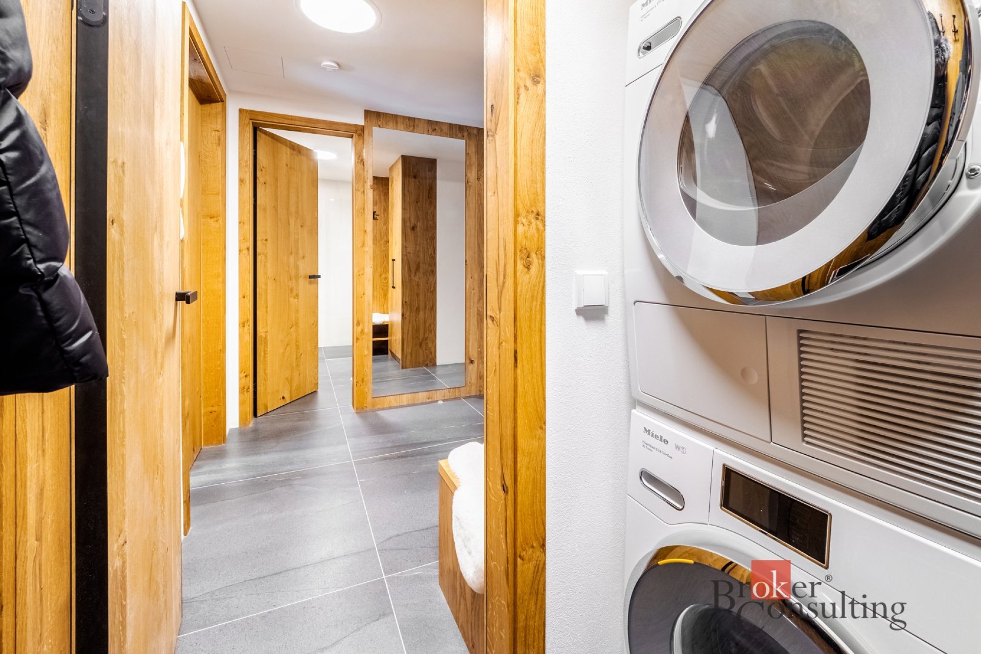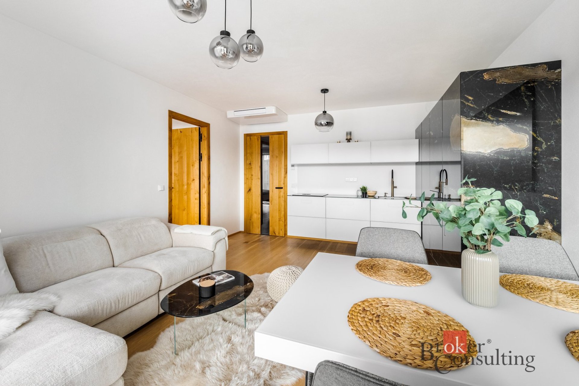 Interiér je kompletně zařízen prémiovým italským nábytkem značky Lago a kombinuje čisté linie s přírodními materiály. Dominantou obývací části je výrazná designová stěna, která prostoru dodává příjemnou atmosféru a podtrhuje jeho moderní a elegantní charakter. Ložnice je vybavena manželskou postelí a vestavěnými úložnými prostory. Vstupní část nabízí dostatek úložného prostoru a působí čistě i přehledně díky vestavěným prvkům a velkému zrcadlu.