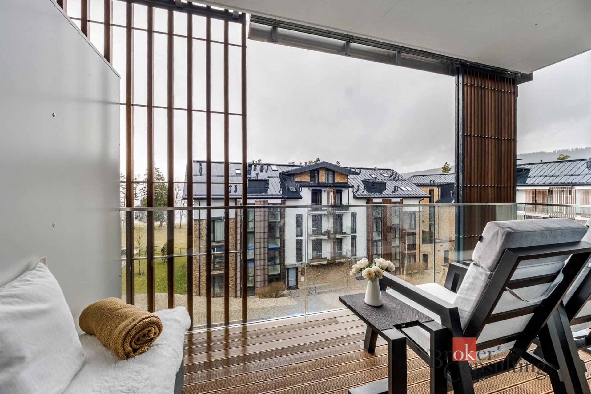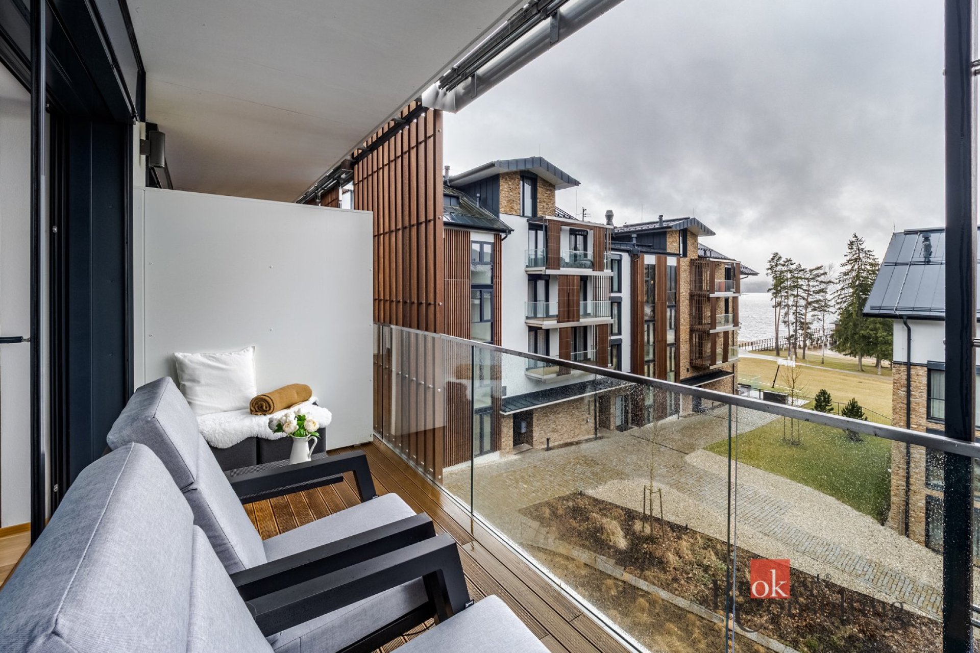 Velká okna a prosklené dveře přivádějí do interiéru dostatek denního světla. Dominantou bytu je však prostorný balkón s dech beroucím výhledem na hladinu Lipenské přehrady, který nabízí dokonalé místo pro relaxaci i společenské chvíle. Součástí prodeje je parkovací stání i sklepní kóje. V domě je k dispozici designová recepce.