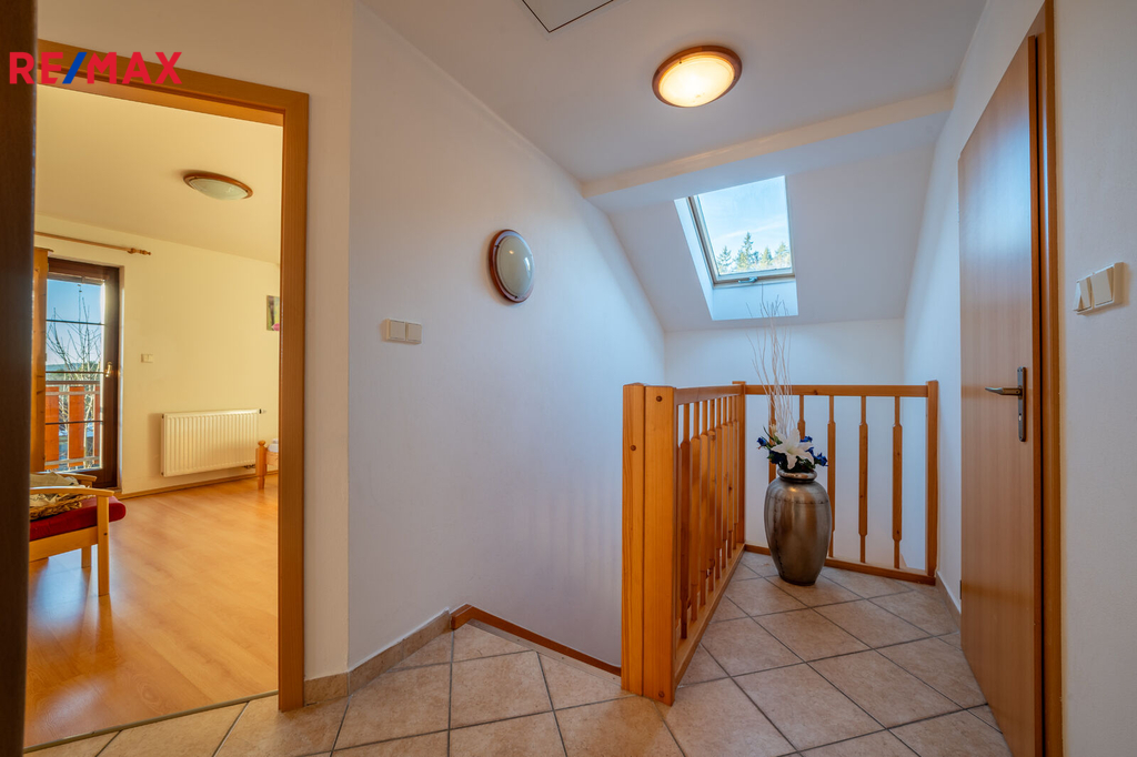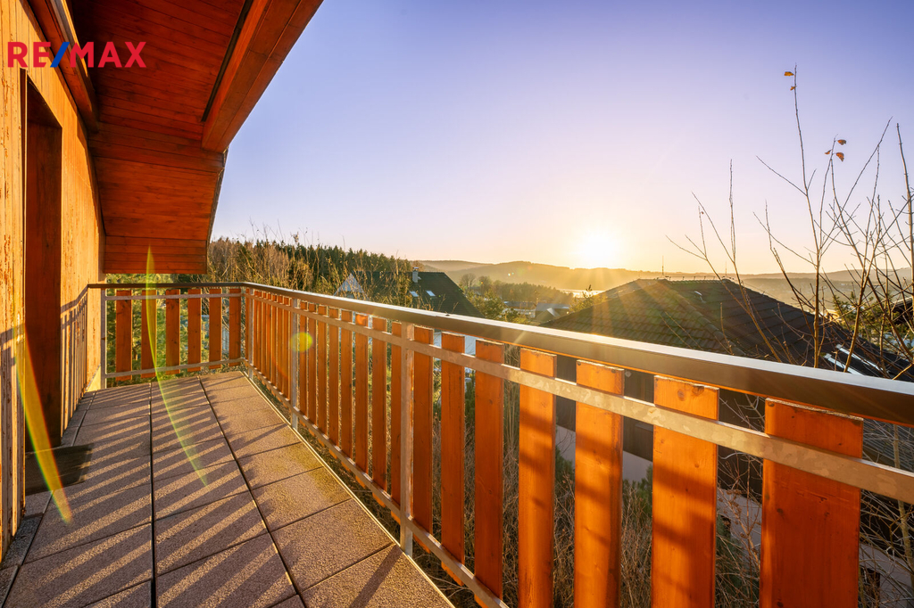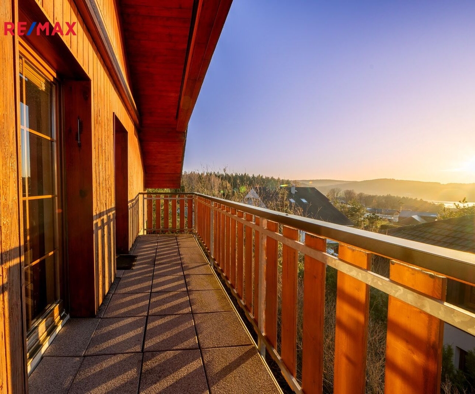 1. patro: tři ložnice (dvě s přístupem na balkon s výhledem na Lipno), koupelna s vanou a WC.