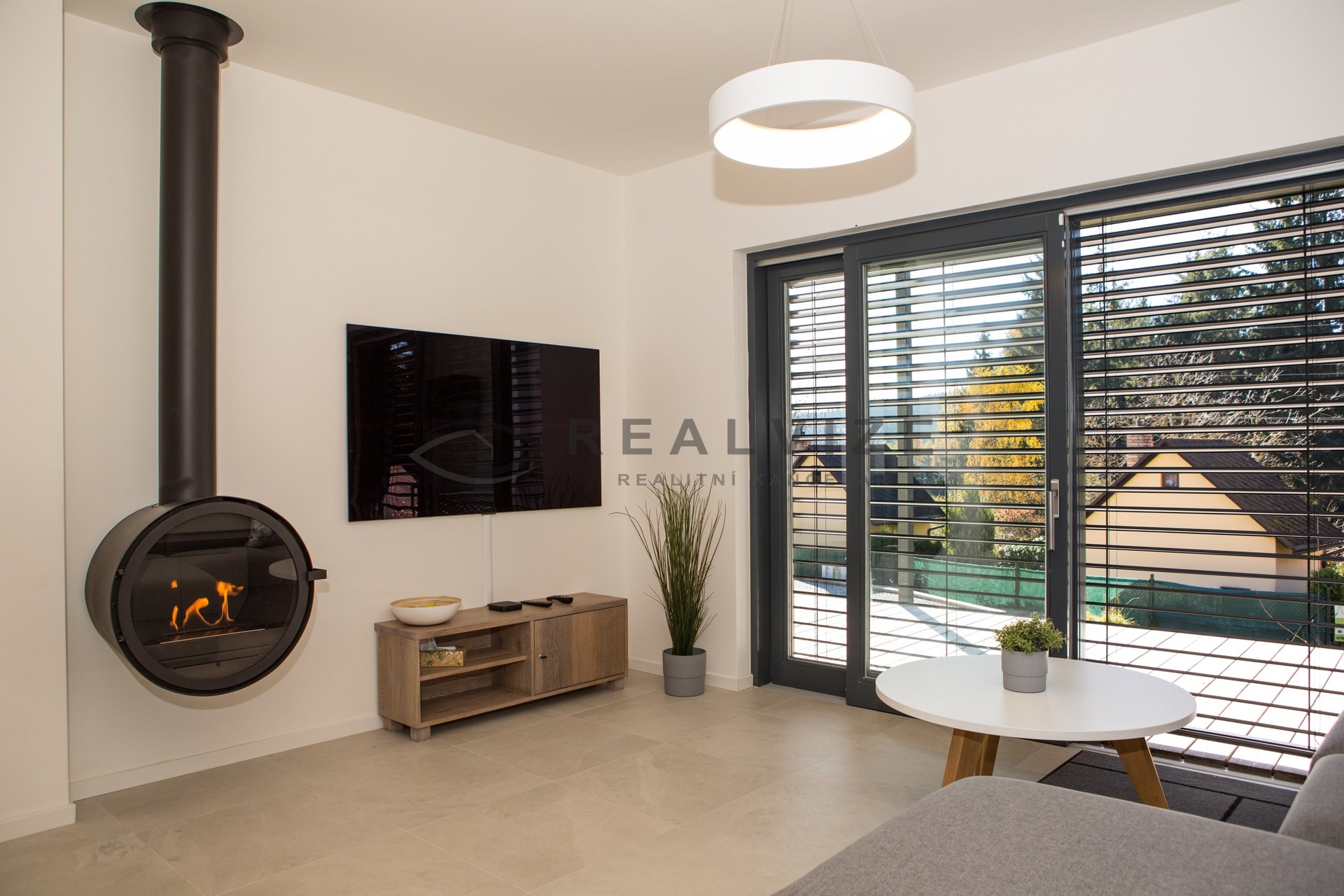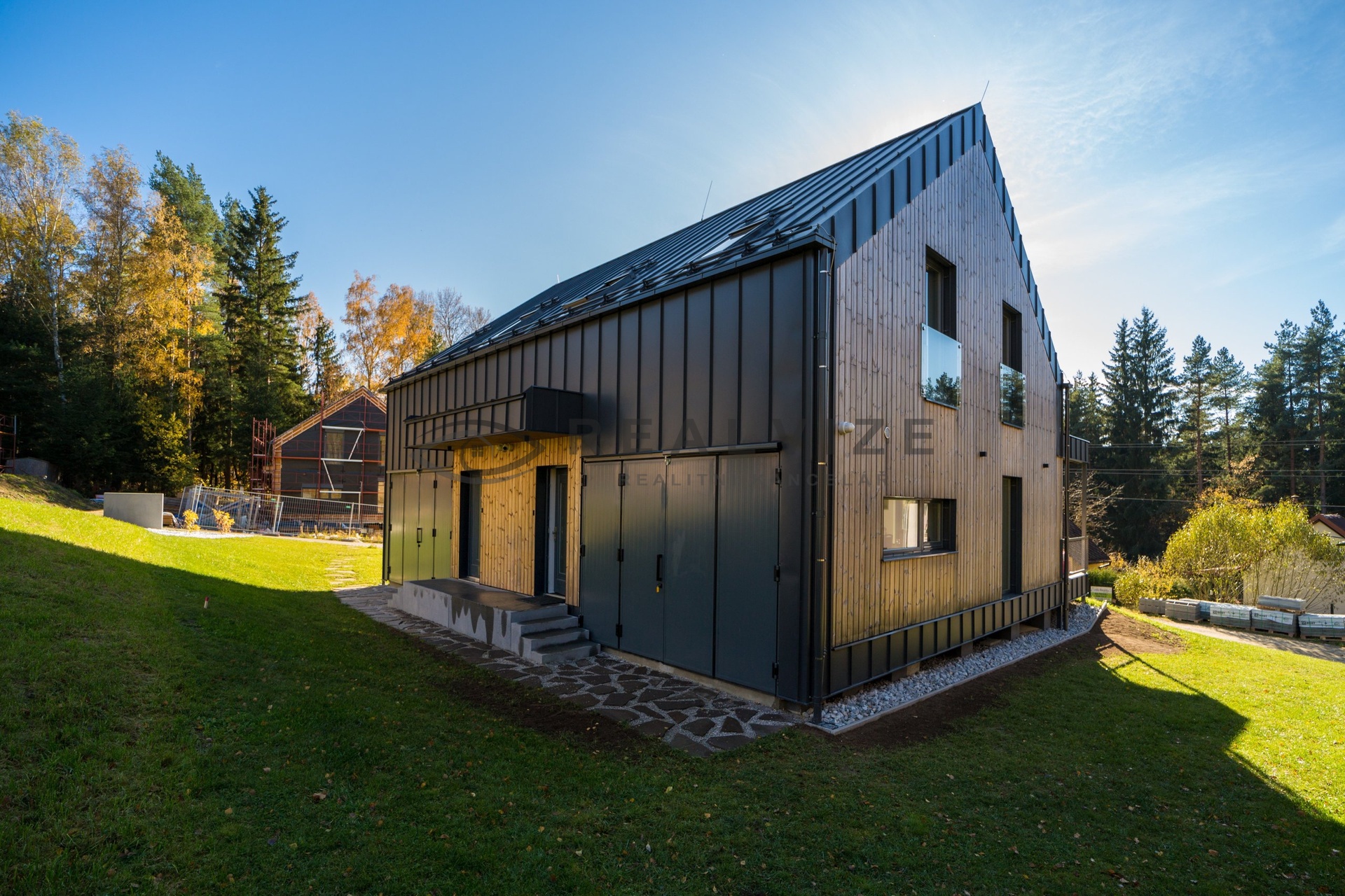 Technologie: Vytápění elektrickým podlahovým topením s možností dálkového řízení, fotovoltaika s akumulací, klimatizace, nabíječka na elektroauto, elektronický zabezpečovací systém, venkovní žaluzie.