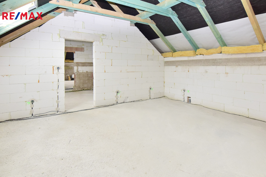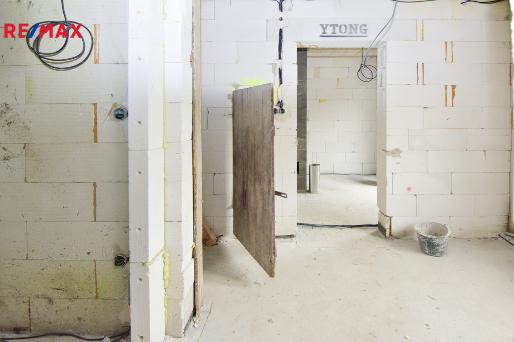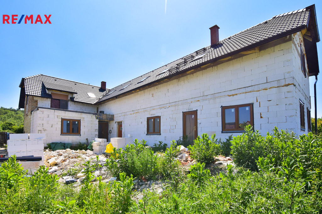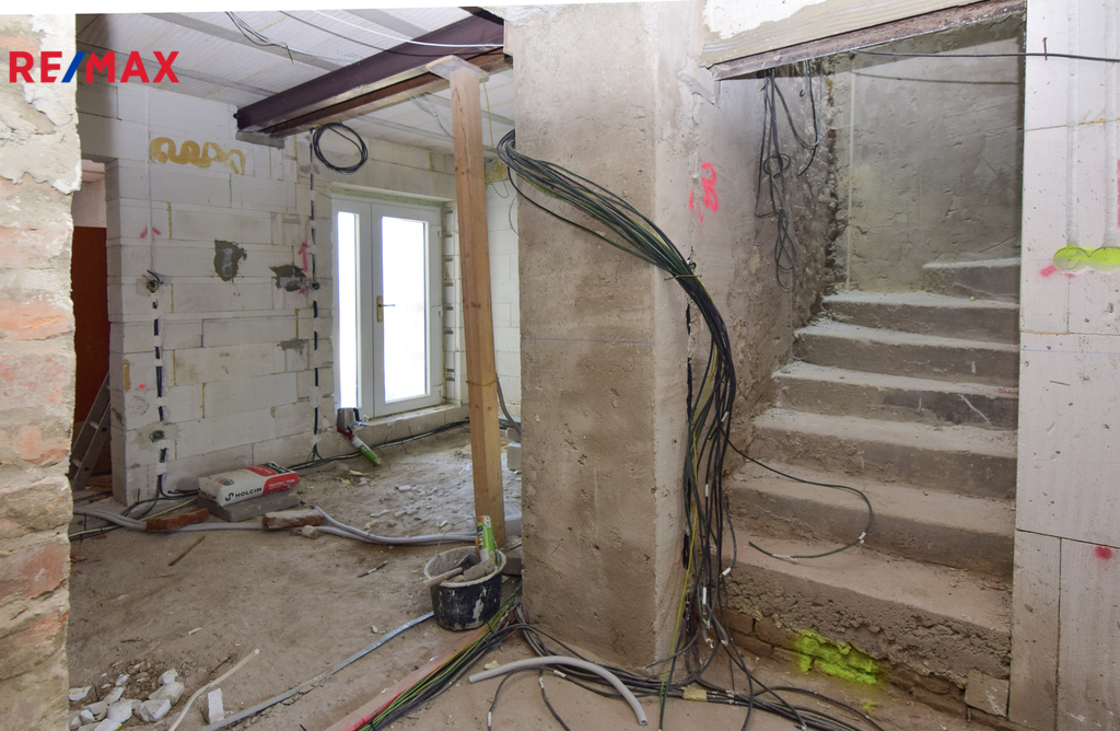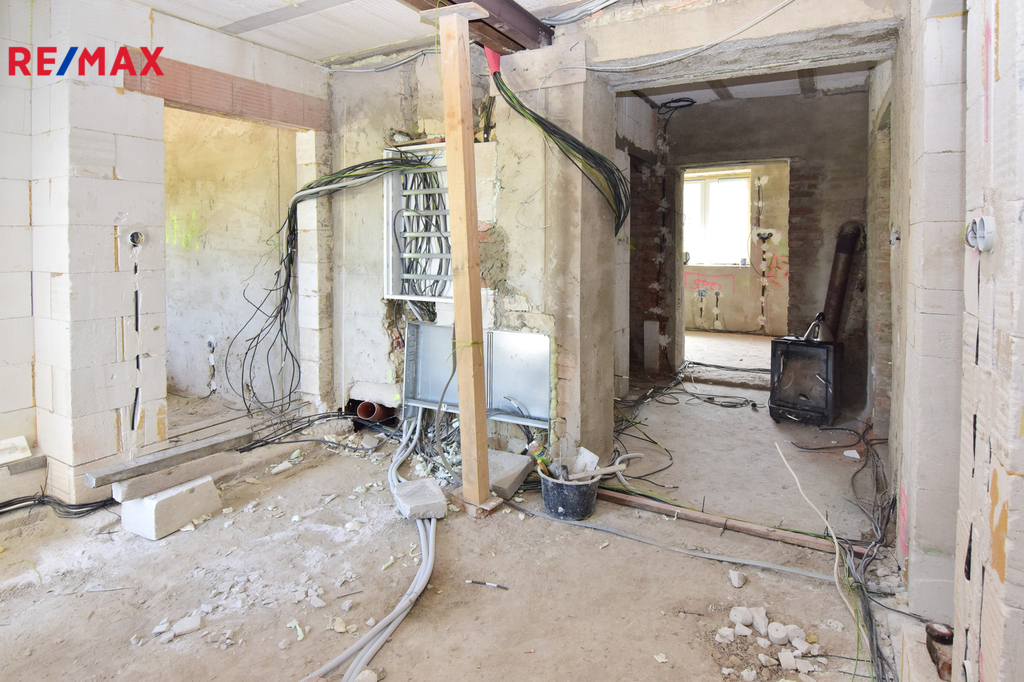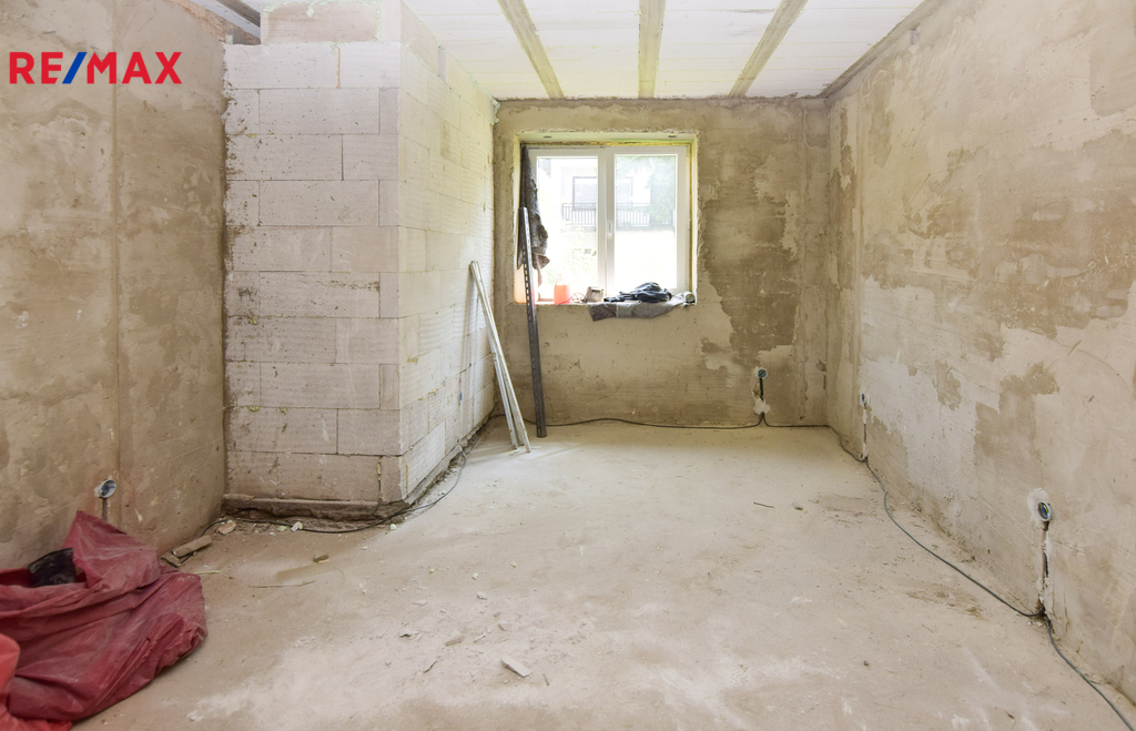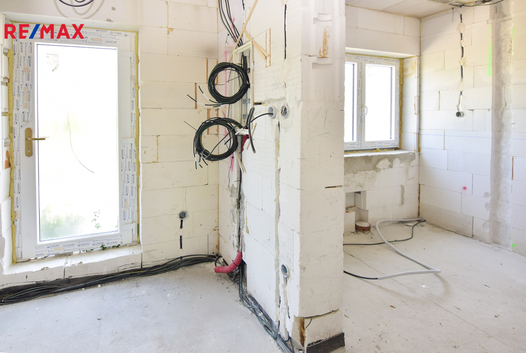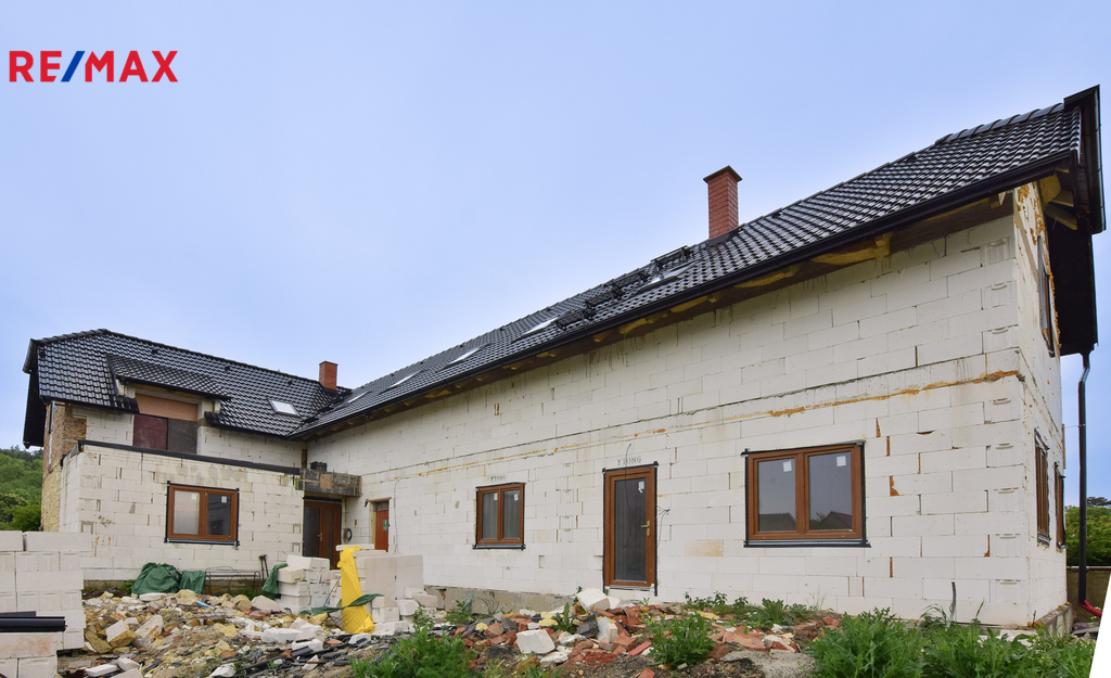 • konstrukčně hotovo: obvodové zdivo, krov, střecha, okna, dispozice