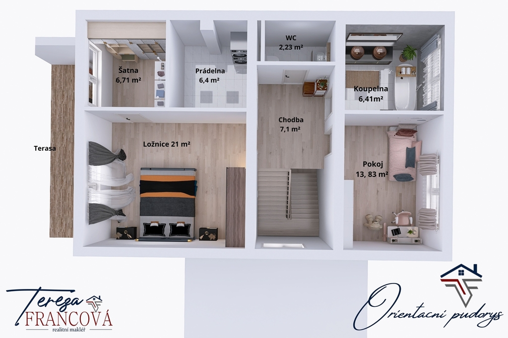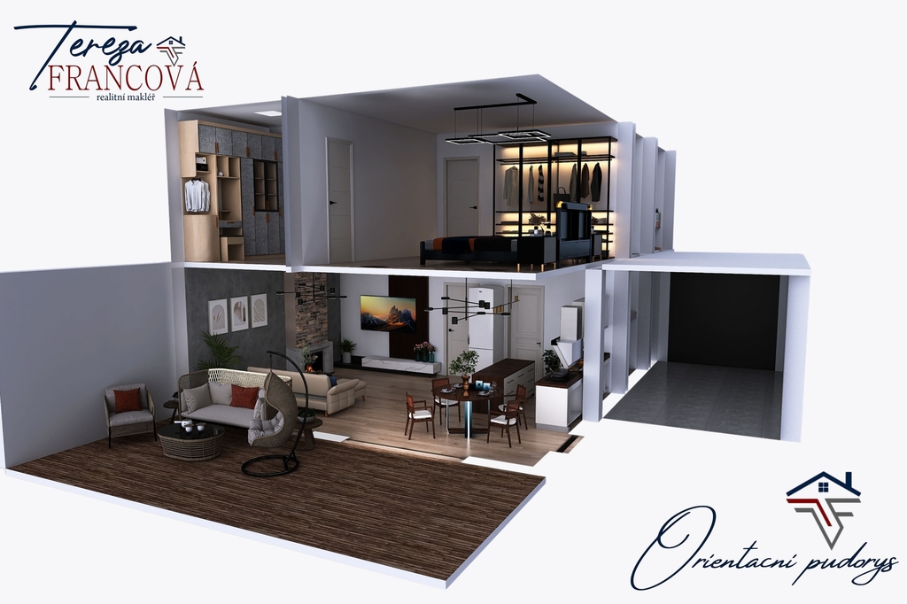 V patře domu je umístěna velkorysá ložnice se samostatnou šatnou, další koupelna, samostatné WC, praktická prádelna a další pokoj.