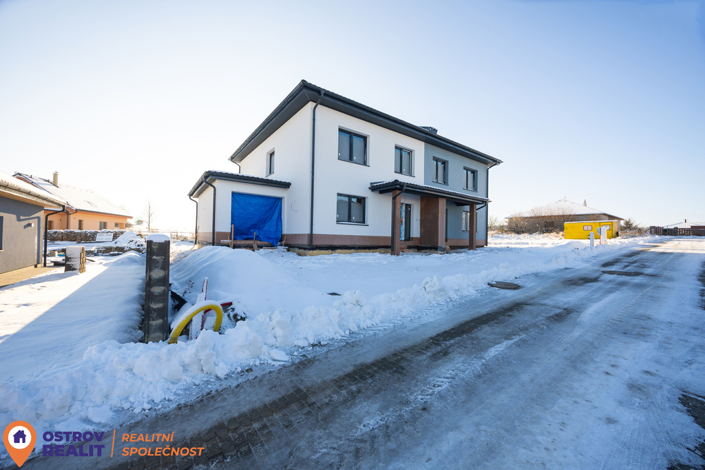 Stavba je ve velmi pokročilé fázi – dům má hotovou světlou fasádu, je kompletně osazen plastovými okny s izolačním trojsklem, vchodovými dveřmi i garážovými vraty. Elektroinstalace je rozvedena a aktuálně probíhají práce na vnitřních částech domu.