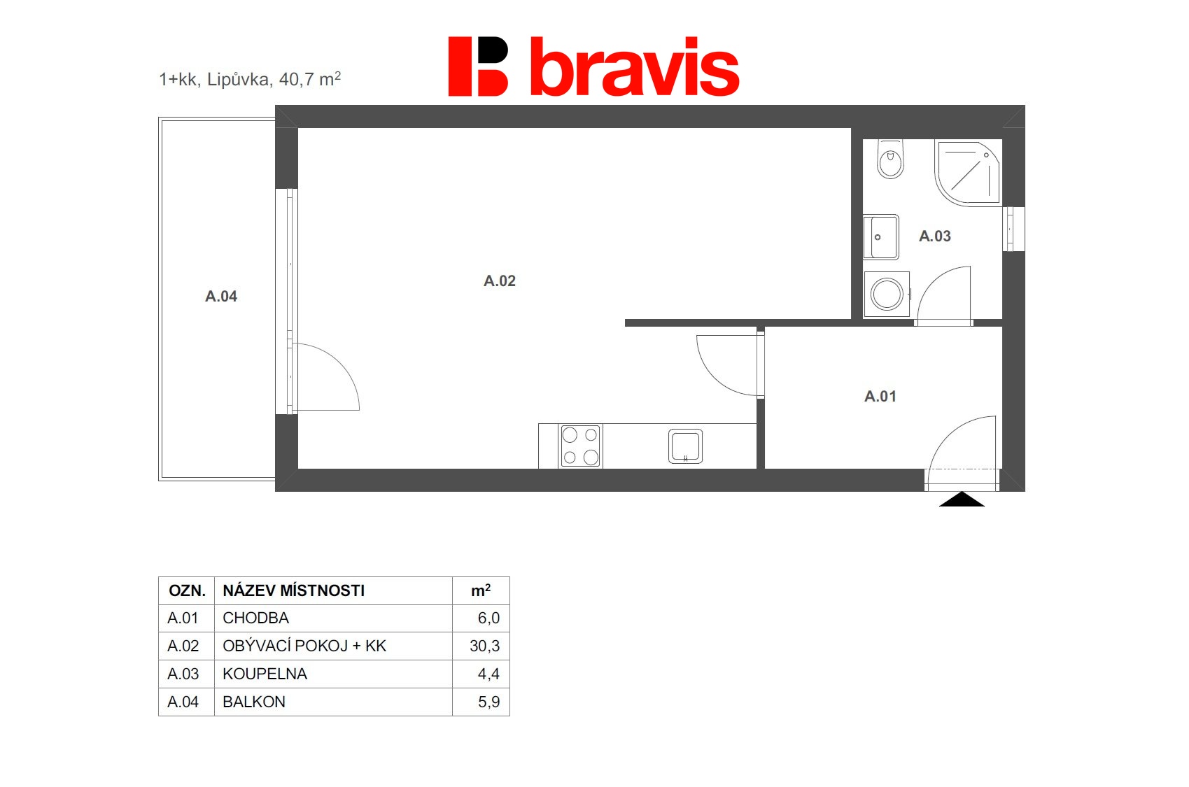 | Dispozice/podlahová plocha: | 1+kk/40 m² |