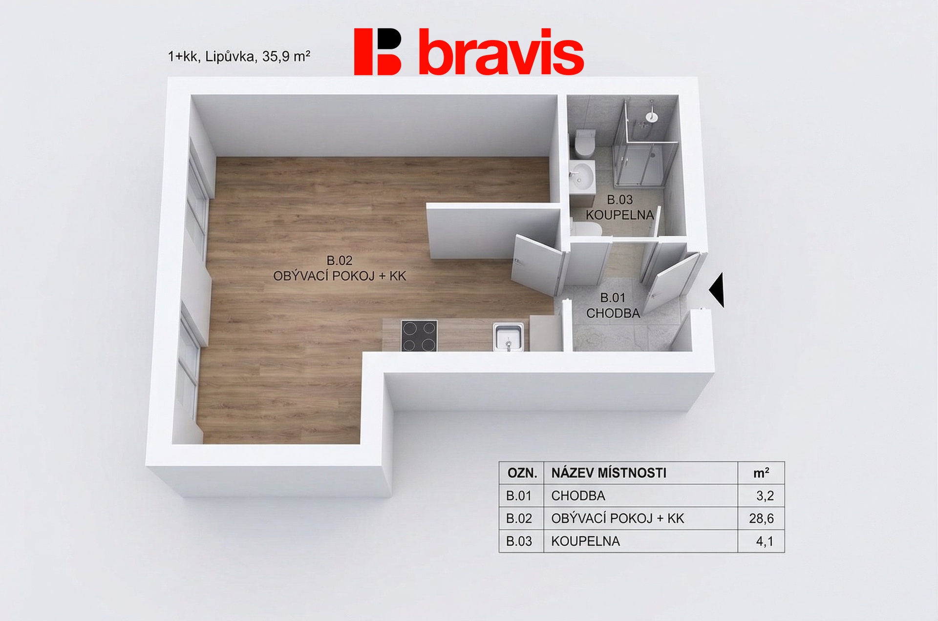 Ve výhradním zastoupení developera nabízíme k prodeji novostavbu bytu o dispozici 1+kk (2B) a užitné ploše 35,9 m² v obci Lipůvka u Brna. Byt nabízí prostoný obývací pokoj s kuchyňským koutem o vel. 28,6 m², chodbu, která nabízí dostatek prostoru pro vestavěný nábytek (3,2 m²) a koupelnu (4,1 m²).