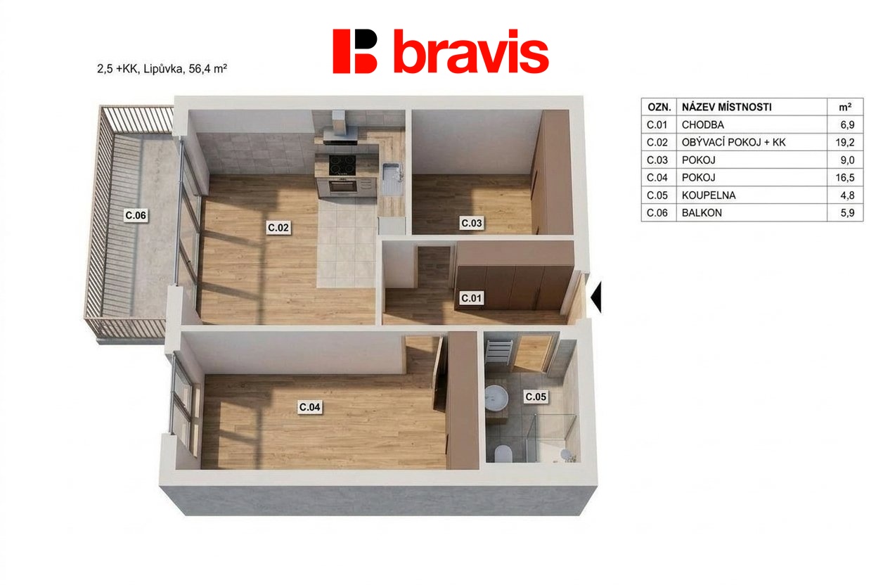 Prodej moderní novostavby bytu 2,5+KK, 56 m2, Lipůvka u Brna, balkon, parkovací stání a sklep v ceně