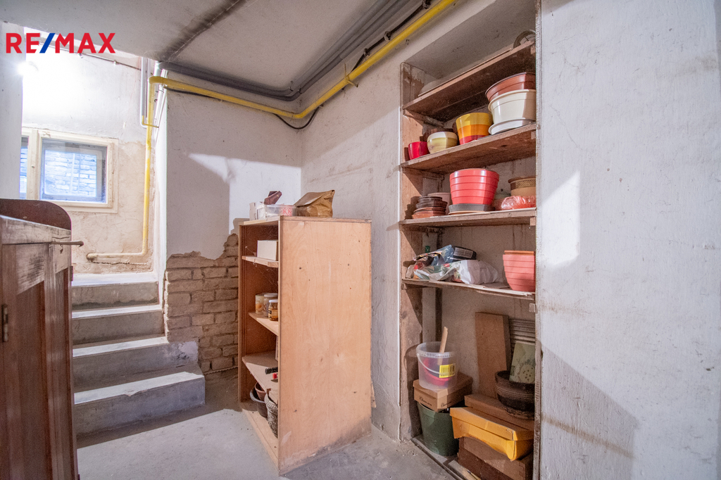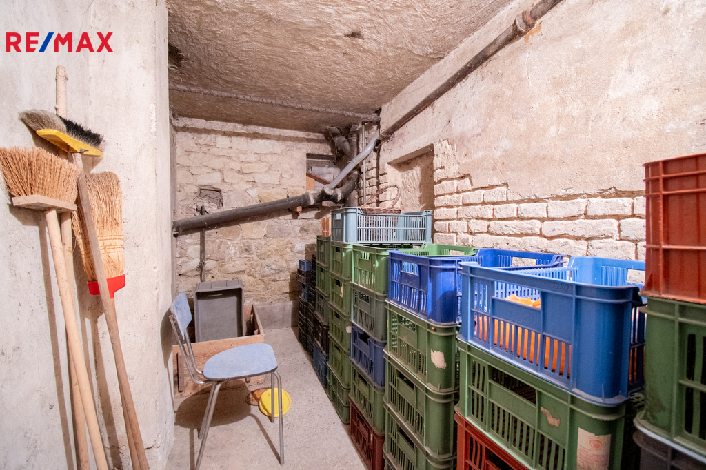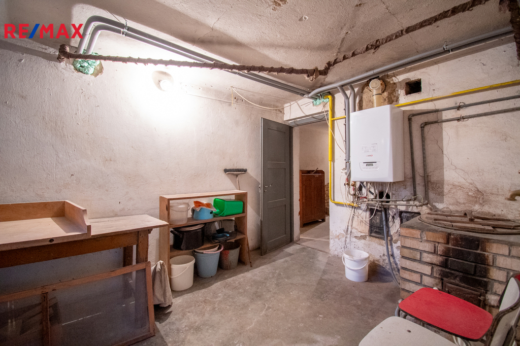 Ve sklepě o výměře necelých třicet metrů čtverečních, který je rozdělen na dvě místnosti se nachází technické zázemí s plynovým kondenzačním kotlem, stáří tři roky, zajišťujícím vytápění i ohřev teplé vody.