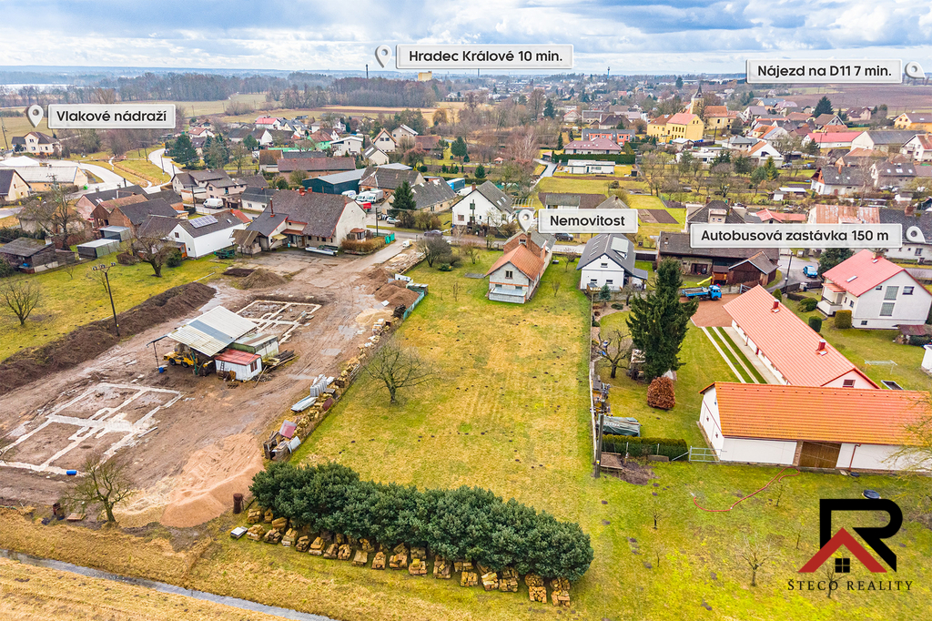 Velkou výhodou této nabídky je samotná dopravní dostupnost. Autobusová zastávka se nachází přibližně 150 metrů od domu a vlakové spojení je v docházkové vzdálenosti. Do Hradce Králové se autem dostanete přibližně za 10 minut a nájezd na dálnici D11 je vzdálen zhruba 7 minut jízdy, což umožňuje rychlé spojení například směrem na Praha.