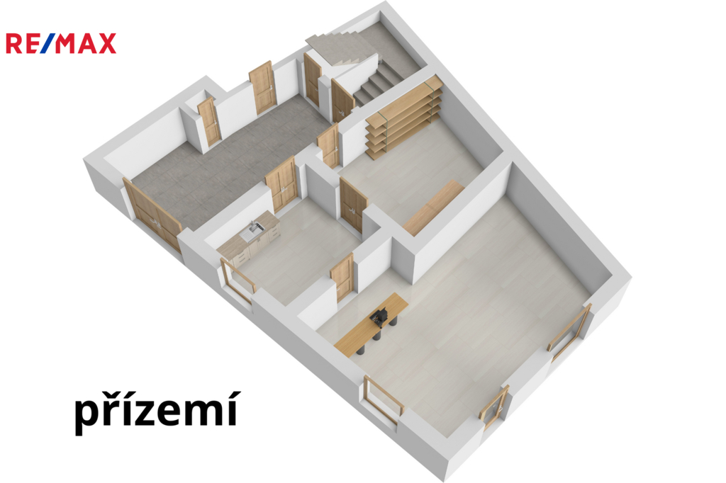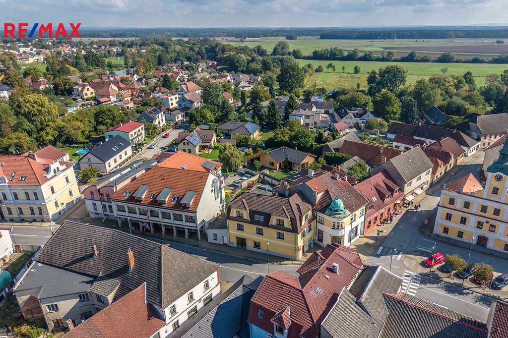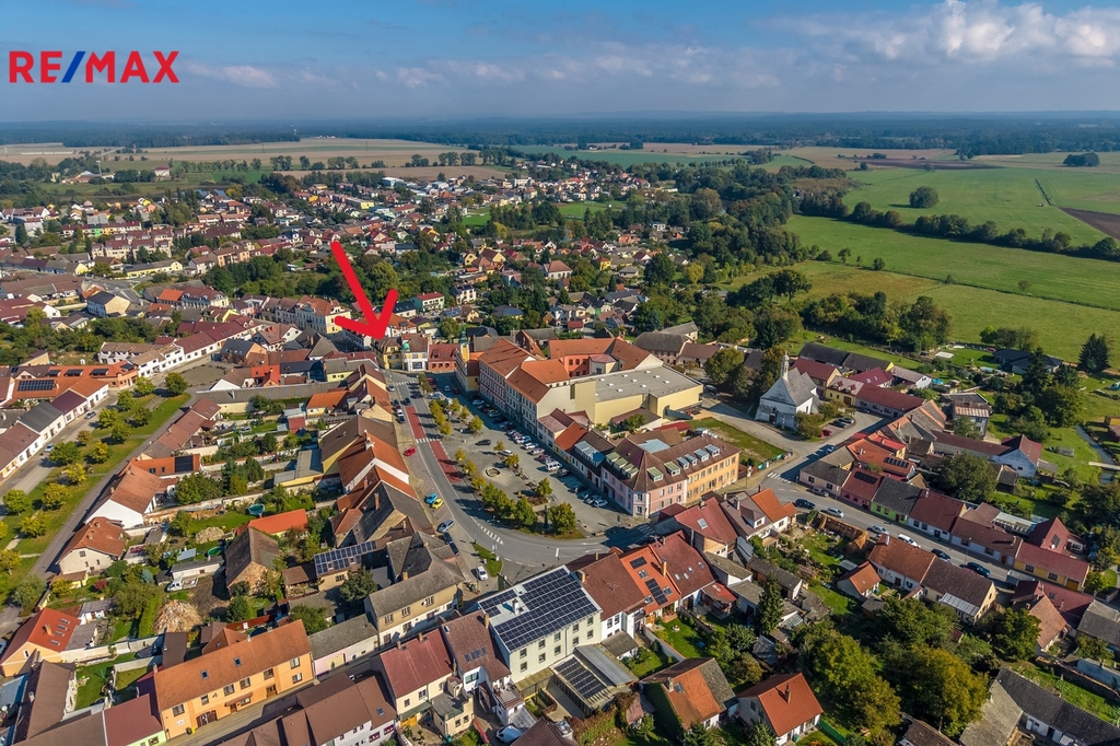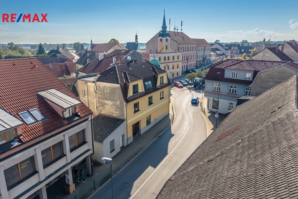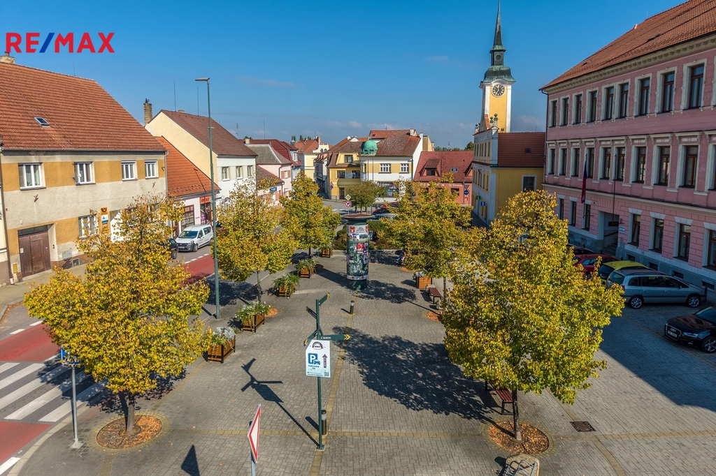 Přízemí objektu tvoří komerční prostory s rozlohou cca 80 m² (prodejní plocha + zázemí) s vlastním vstupem z přímo z náměstí 5. května – ideální pro obchod, kavárnu, kancelář či jiné podnikání.