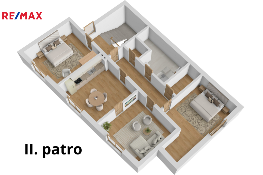Druhé a třetí podlaží jsou koncipována jako samostatné bytové jednotky o dispozici 3+1 s užitnou plochou cca 112 m² a 102 m².