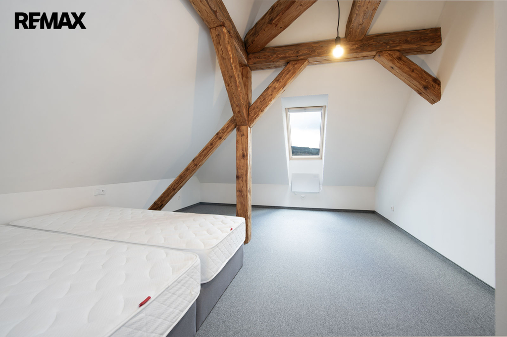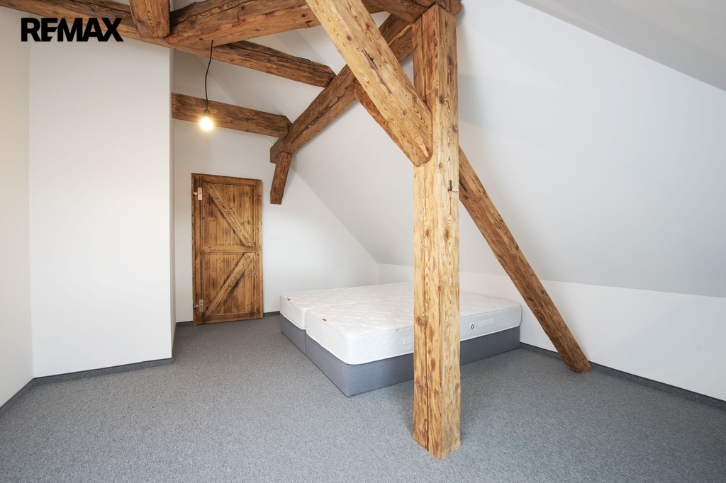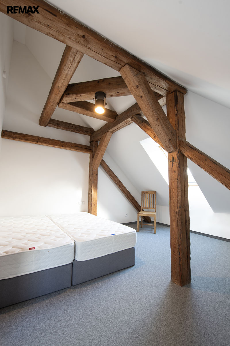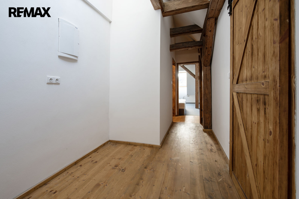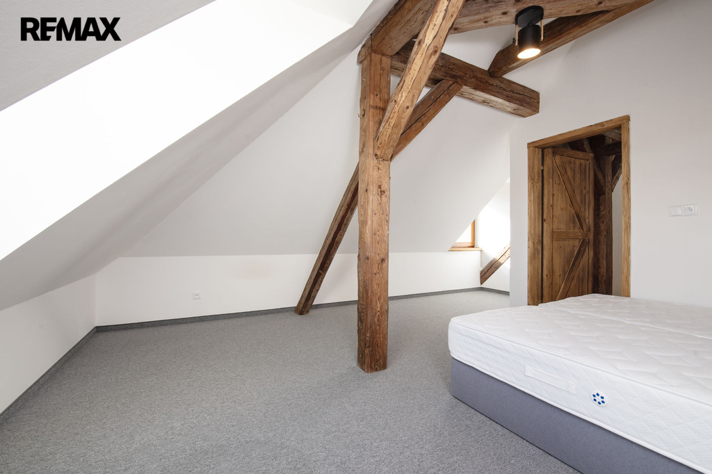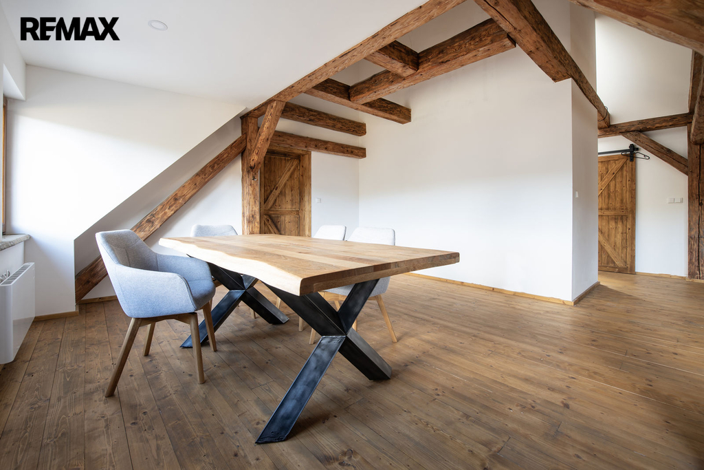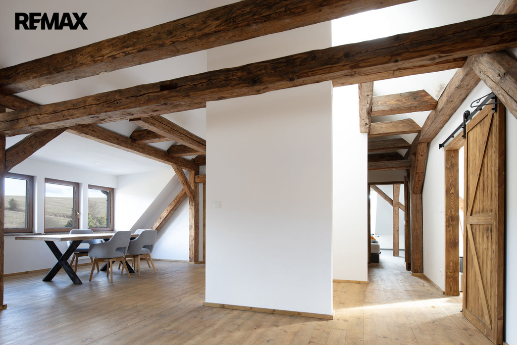 Nadstandartní vnitřní dispozice 3+kk na ploše 92 m2 nabídne dostatek prostoru i větší skupině lidí. Celý apartmán působí vzdušně a světle díky kombinaci klasických a střešních oken, odkud je krásný výhled do okolí. Horský charakter apartmánu je podtržen přiznanými původními střešními trámy.