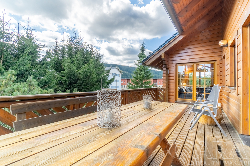Atmosféru domova podtrhuje krb v obývacím pokoji i venkovní terasa, která zve k posezení a odpočinku, ať už s ranní kávou či po návratu ze sjezdovky.